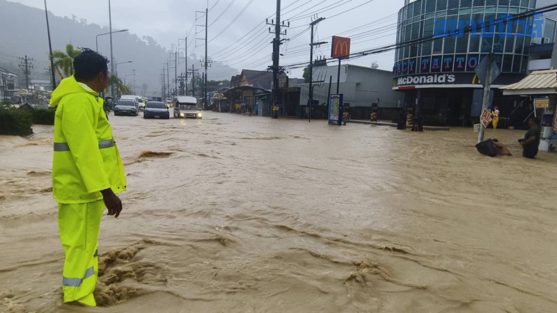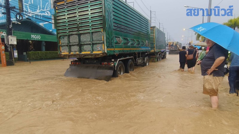 จนท่วมถนนทั้งสองฝั่งระยะทางยาวกว่า 800 เมตร เนื่องจากเป็นที่ลุ่มและได้ส่งผลให้รถวิ่งบนถนนเพชรเกษมทั้งฝั่งจากอำเภอตะกั่วป่ามุ่งหน้าอำเภอท้ายเหมืองและจากอำเภอท้ายเหมืองมุ่งหน้าอำเภอตะกั่วป่าไม่สามารถแล่นผ่านได้รถติดยาวฝั่งละเกือบ 1 กิโเมตร เนื่องจากปริมาณมวลน้ำที่สูงกว่า 1 เมตร อีกทั้งกระแสน้ำน้ำมีความแรงทำให้รถรถเล็กโดยเฉพาะรถยนต์ไฟฟ้า รถมอเตอร์ไซด์จอดเสีย 5-6 คัน ทางเจัาหน้าที่ ปภ.จังหวัดพังงา ตร.สภ.เขาหลัก เจ้าหน้าที่เทศบาลตำบลคึกคักเร่งเข้าช่วยโดยเร่งด่วน ขณะที่นักท่องเที่ยวที่มีกำหนดการเดินทางกลับต้องไปขึ้นเครื่อง ต้องประสบปัญหารถตู้ไม่สามารถแล่นผ่านได้ต้องใช้วิธีขนถ่ายกระเป๋าเดินทางเดินลุยน้ำเพื่อไปขึ้นรถที่มาจอดรออีกฝั่ง