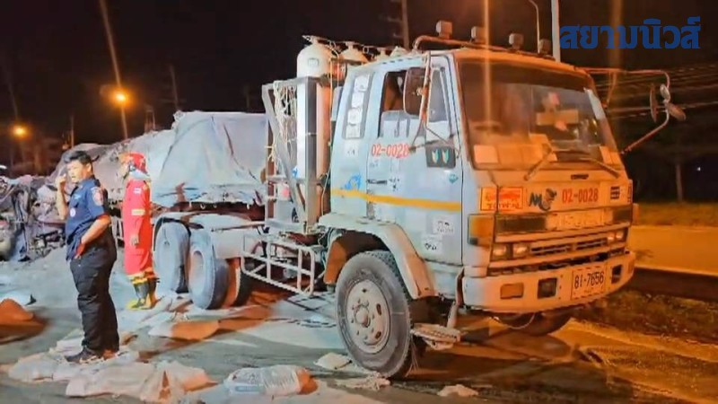 จากการตรวจสอบในที่เกิดเหตุ พบว่า รถบรรทุก 6 ล้อปูนถุงของบริษัท วัชระอุทัยกุล จำกัดได้ชนเข้ากับบริเวณด้านท้ายของรถบรรทุกปูนเทรนเลอร์ สภาพรถหกล้อยุบบริเวณด้านหน้า และได้เกิดไฟไหม้ขึ้นบริเวณหัวเก๋งรถหกล้อ เจ้าหน้าที่กู้ภัยฯได้ใช้อุปกรณ์ตัดถ่าง งัดร่างของผู้เสียชีวิตออกมาจากตัวรถ พบศพคนขับถูกไฟไหม้เกรียม (ไม่ทราบชื่อเนื่องจากเอกสารในรถไฟไหม้หมด)