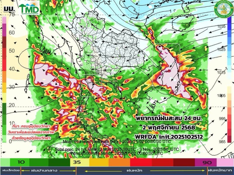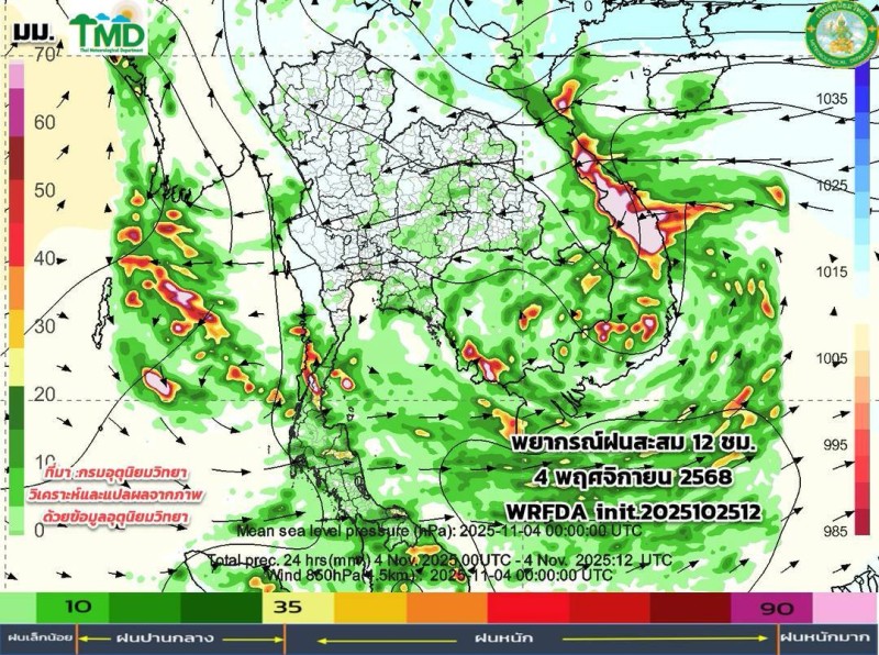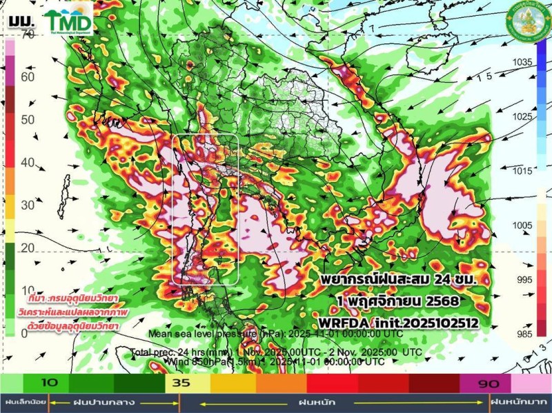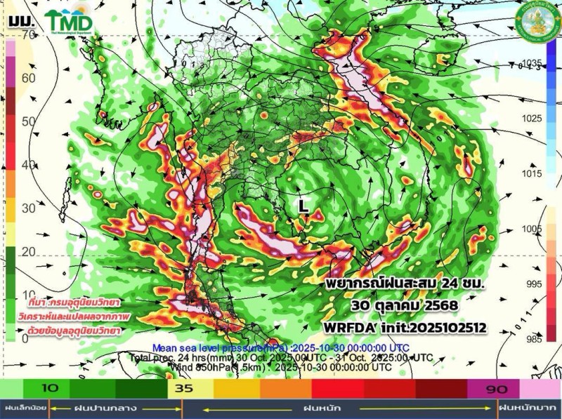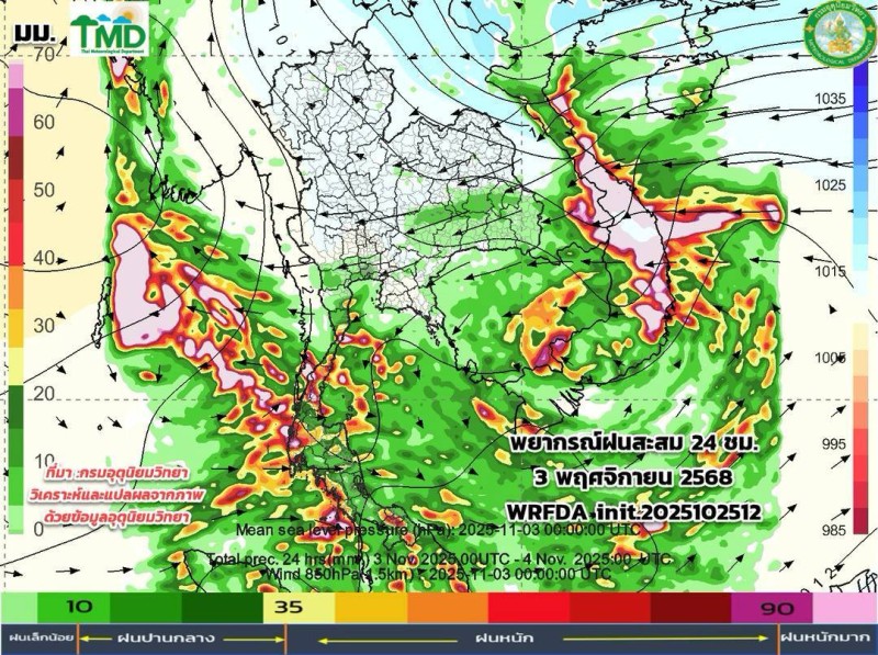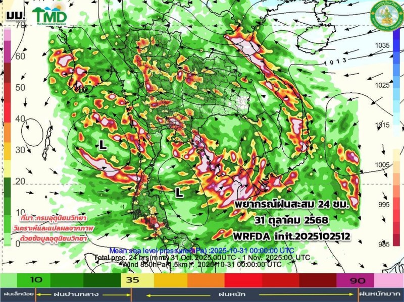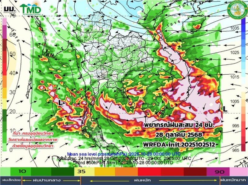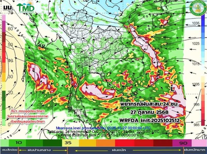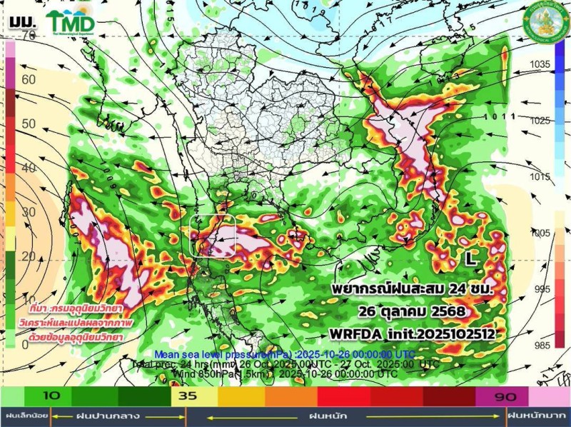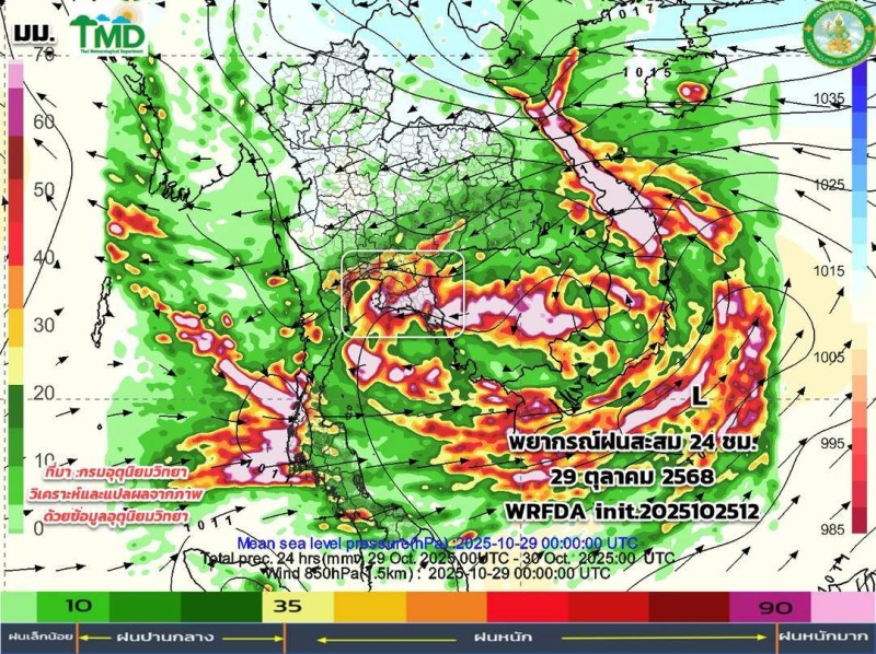 เมื่อวันที่ 26 ตุลาคม 2568 ศูนย์ประชาสัมพันธ์กรมอุตุนิยมวิทยา ประกาศผลการพยากรณ์ฝนสะสมรายวัน ผ่านเพจเฟซบุ๊ก กรมอุตุนิยมวิยา โดยระบุว่า อัปเดตผลการพยากรณ์ฝนสะสมรายวัน (ทุก ๆ 24 ชม. นับตั้งแต่ 07.00 น. ถึง 07.00 น.วันรุ่งขึ้น และลมที่ระดับ 850hPa 1.5 กม.10 วันล่วงหน้า ระหว่าง 26 ต.ค. - 4 พ.ย. 68 จากแบบจำลองของกรมอุตุนิยมวิทยา (TMD-WRFDA) เฉดสีแสดงถึงปริมาณฝน (มม.) สีเขียวฝนเล็กน้อย สีแดงหมายถึงฝนหนัก (มากว่า 35.1มม.)