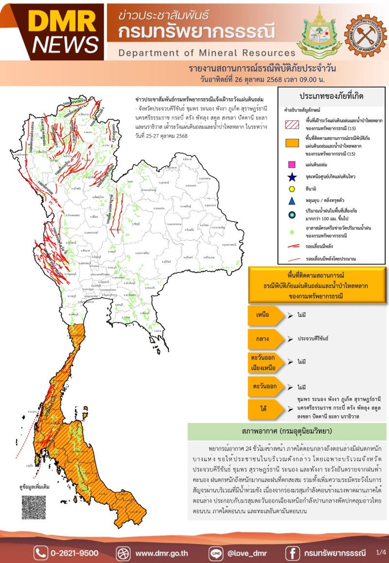 เมื่อวันที่ 26 ตุลาคม 2568 ศูนย์ปฏิบัติการธรณีพิบัติภัย กรมทรัพยากรธรณี กระทรวงทรัพยากรธรรมชาติและสิ่งแวดล้อม ออกประกาศแจ้งเตือนให้เฝ้าระวังสถานการณ์แผ่นดินถล่ม และน้ำป่าไหลหลาก ในระหว่างวันที่ 26-27 ตุลาคม นี้ ในพื้นที่ 15 จังหวัด ได้เเก่ จังหวัดประจวบคีรีขันธ์ ชุมพร ระนอง พังงา ภูเก็ต สุราษฎร์ธานี นครศรีธรรมราช กระบี่ ตรัง พัทลุง สตูล สงขลา ปัตตานี ยะลา และนราธิวาส