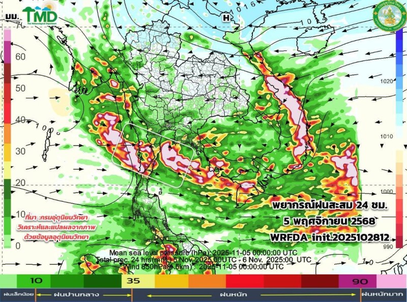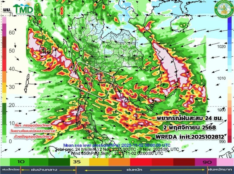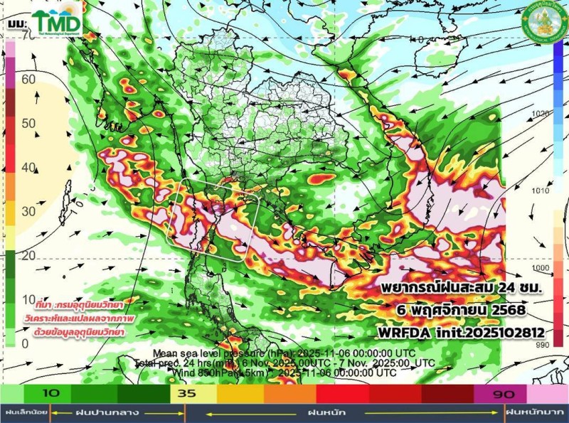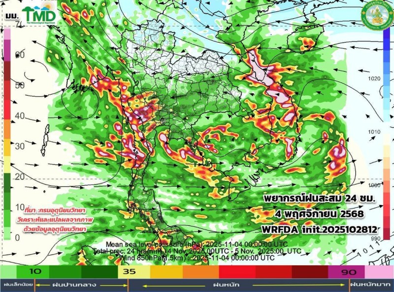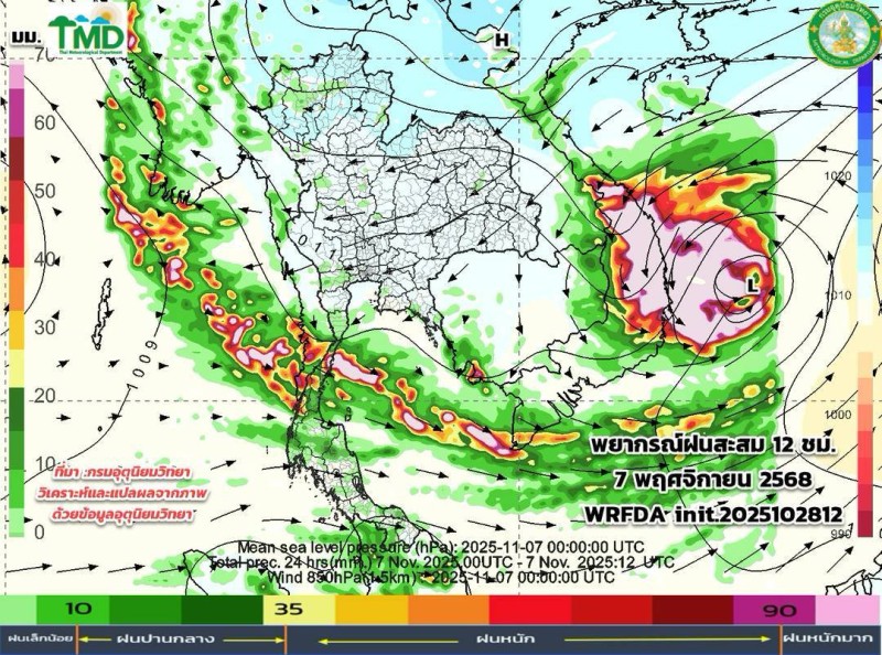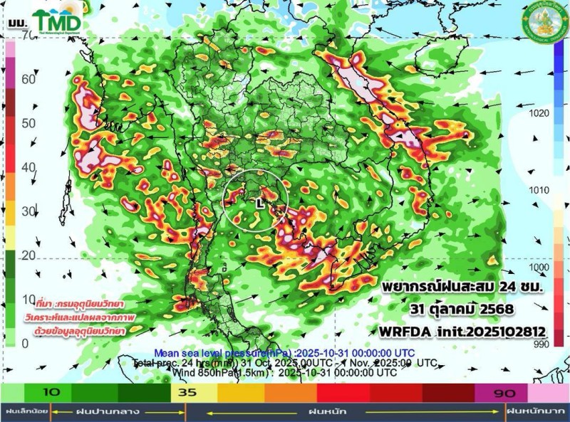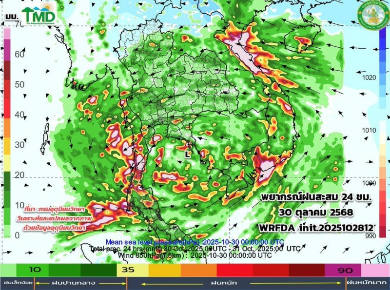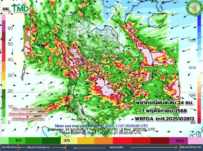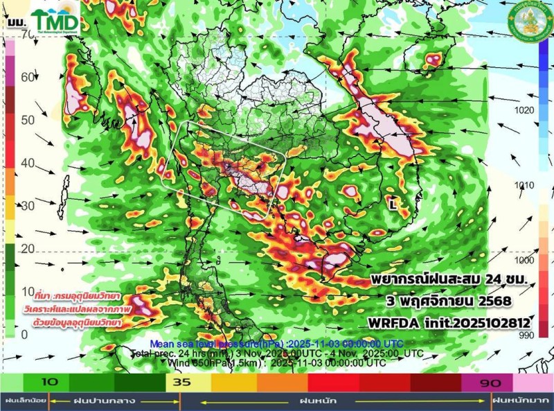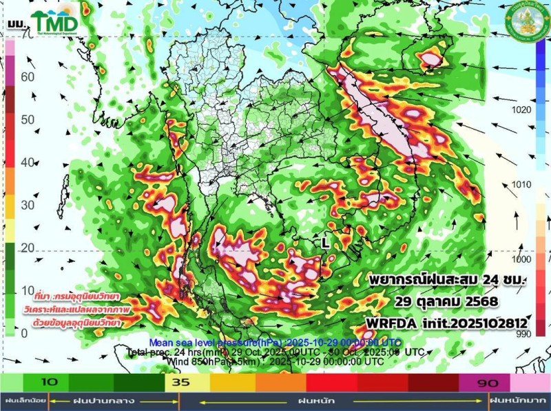 เมื่อวันที่ 29 ตุลาคม 2568 ศูนย์ประชาสัมพันธ์กรมอุตุนิยมวิทยา ประกาศผลการพยากรณ์ฝนสะสมรายวัน ผ่านเพจเฟซบุ๊ก กรมอุตุนิยมวิยา โดยระบุว่า อัปเดตผลการพยากรณ์ฝนสะสมรายวัน (ทุก ๆ 24 ชม. นับตั้งแต่ 07.00 น. ถึง 07.00 น.วันรุ่งขึ้น และลมที่ระดับ 850hPa 1.5 กม.10 วันล่วงหน้า ระหว่าง 29 ต.ค. - 7 พ.ย. 68 จากแบบจำลองของกรมอุตุนิยมวิทยา (TMD-WRFDA) เฉดสีแสดงถึงปริมาณฝน (มม.) สีเขียวฝนเล็กน้อย สีแดงหมายถึงฝนหนัก (มากว่า 35.1มม.)