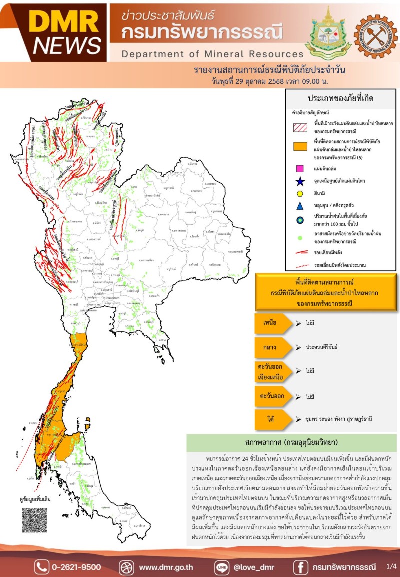 เมื่อวันที่ 29 ตุลาคม 2568 ศูนย์ปฏิบัติการธรณีพิบัติภัย กรมทรัพยากรธรณี กระทรวงทรัพยากรธรรมชาติและสิ่งแวดล้อม ออกประกาศแจ้งเตือนให้เฝ้าระวังสถานการณ์แผ่นดินถล่ม และน้ำป่าไหลหลาก ในพื้นที่ 5 จังหวัด ได้เเก่ จังหวัดประจวบคีรีขันธ์ ชุมพร ระนอง พังงา และสุราษฎร์ธานี
