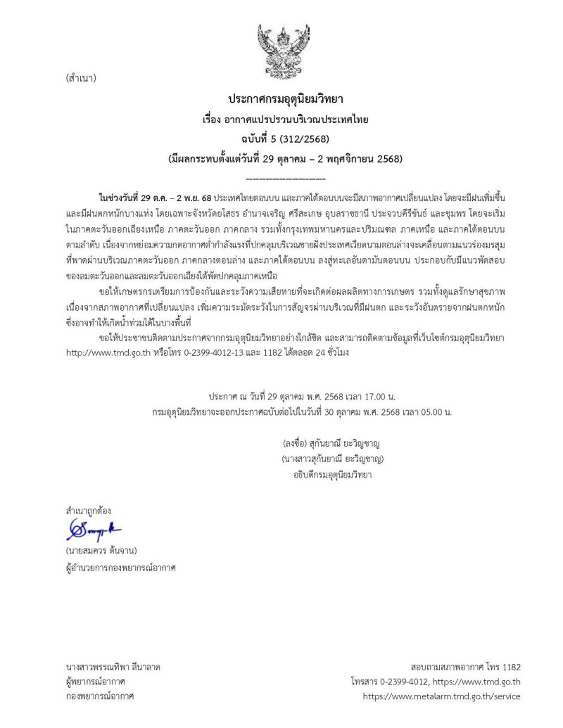 เมื่อวันที่ 29 ตุลาคม 2568 กรมอุตุนิยมวิทยา ออกประกาศเรื่อง อากาศแปรปรวนบริเวณประเทศไทย ฉบับที่ 5 (312/2568) มีผลกระทบตั้งแต่วันที่ 29 ตุลาคม ถึง 2 พฤศจิกายน พ.ศ. 2568 ระบุว่า ในช่วงเวลาดังกล่าว ประเทศไทยตอนบนและภาคใต้ตอนบนจะมีสภาพอากาศเปลี่ยนแปลง โดยจะมีฝนเพิ่มขึ้นและมีฝนตกหนักบางแห่ง โดยเฉพาะจังหวัดยโสธร อำนาจเจริญ ศรีสะเกษ อุบลราชธานี ประจวบคีรีขันธ์ และชุมพร
