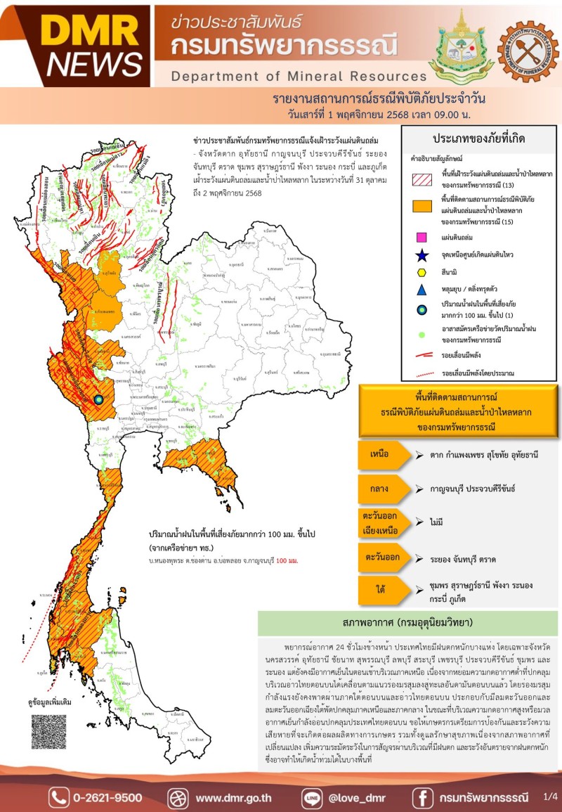 เมื่อวันที่ 1 พฤศจิกายน 2568 ศูนย์ปฏิบัติการธรณีพิบัติภัย กรมทรัพยากรธรณี กระทรวงทรัพยากรธรรมชาติและสิ่งแวดล้อม ออกประกาศแจ้งเตือนให้เฝ้าระวังสถานการณ์แผ่นดินถล่ม และน้ำป่าไหลหลาก ในพื้นที่ 15 จังหวัด ได้เเก่ จังหวัดตาก กำแพงเพชร สุโขทัย อุทัยธานี กาญจนบุรี ประจวบคีรีขันธ์ ระยอง จันทบุรี ตราด ชุมพร สุราษฎร์ธานี พังงา ระนอง กระบี่ และภูเก็ต