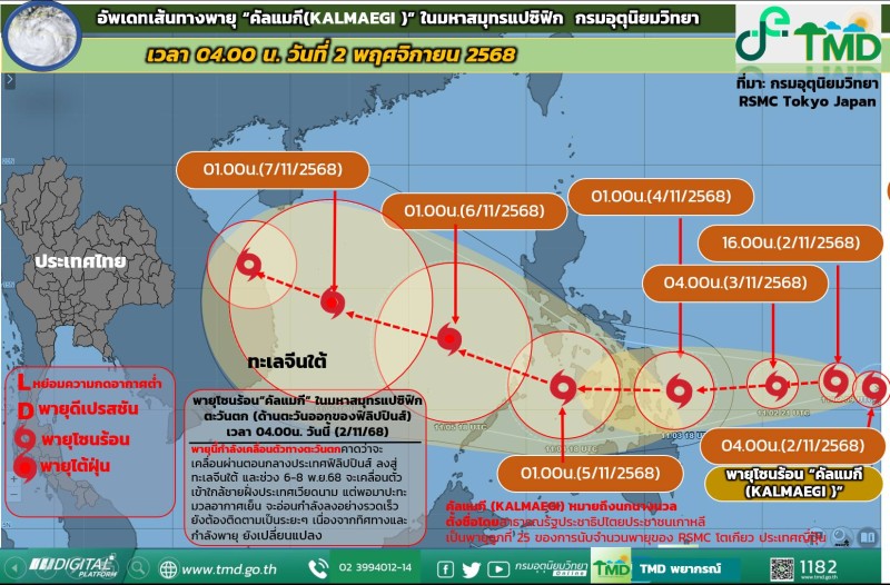 เมื่อวันที่ 2 พฤศจิกายน 2568 กรมอุตุนิยมวิทยา ได้รายงาน อัพเดทเส้นทางพายุในมหาสมุทรแปซิฟิกเช้าวันนี้ พายุโซนร้อน คัลแมกี (KALMAEGI) ในมหาสมุทรแปซิฟิกตะวันตก (ทางตะวันออกของประเทศฟิลิปปินส์) กำลังเคลื่อนตัวทางตะวันตกที่คาดว่าจะเคลื่อนผ่านตอนกลางประเทศฟิลิปปินส์ ลงสู่ทะเลจีนใต้