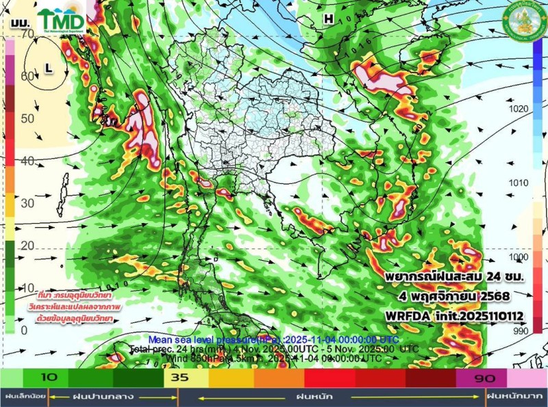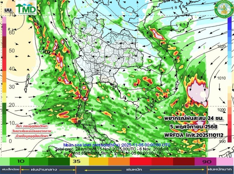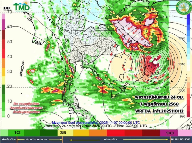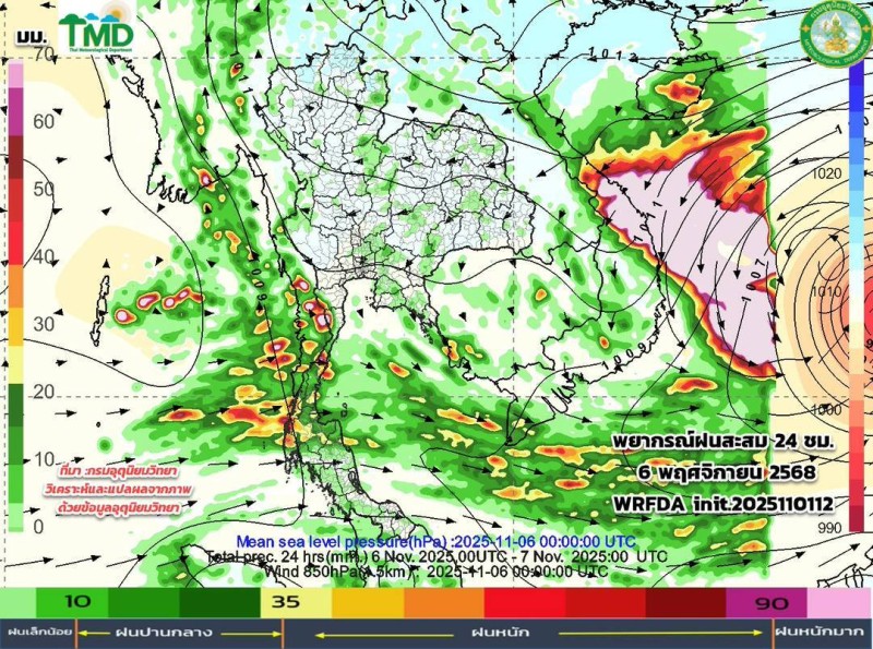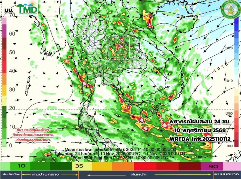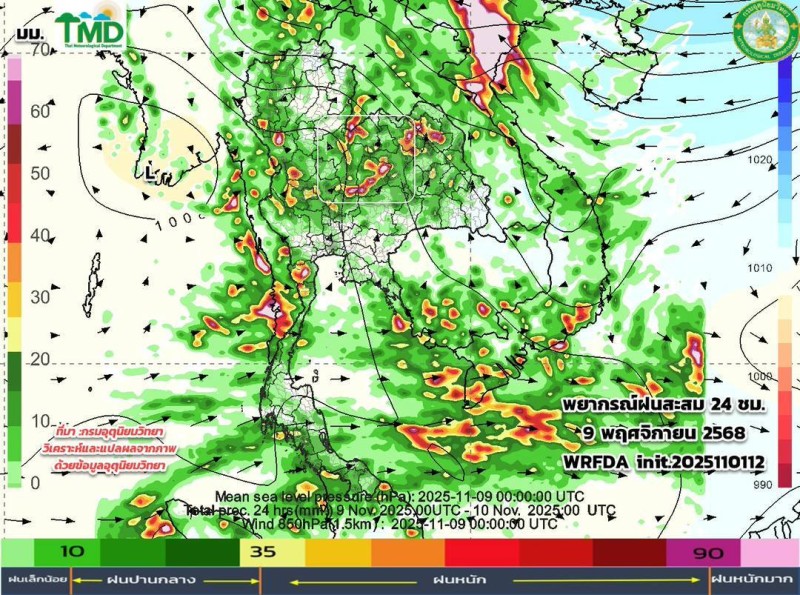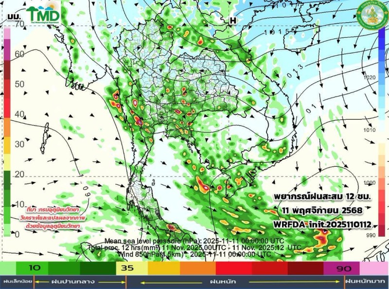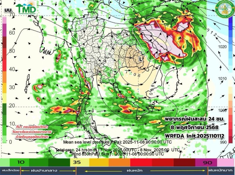 เมื่อวันที่ 2 พฤศจิกายน 2568 ศูนย์ประชาสัมพันธ์กรมอุตุนิยมวิทยา ประกาศผลการพยากรณ์ฝนสะสมรายวัน ผ่านเพจเฟซบุ๊ก กรมอุตุนิยมวิยา โดยระบุว่า อัปเดตผลการพยากรณ์ฝนสะสมรายวัน (ทุก ๆ 24 ชม. นับตั้งแต่ 07.00 น. ถึง 07.00 น.วันรุ่งขึ้น และลมที่ระดับ 850hPa 1.5 กม.10 วันล่วงหน้า ระหว่าง วันที่ 2 - 11 พ.ย. 68 จากแบบจำลองของกรมอุตุนิยมวิทยา (TMD-WRFDA) เฉดสีแสดงถึงปริมาณฝน (มม.) สีเขียว หมายถึง ฝนเล็กน้อย สีเหลือง-ส้ม หมายถึง ฝนปานกลาง สีแดง หมายถึง ฝนหนัก (มากว่า 35.1มม.)