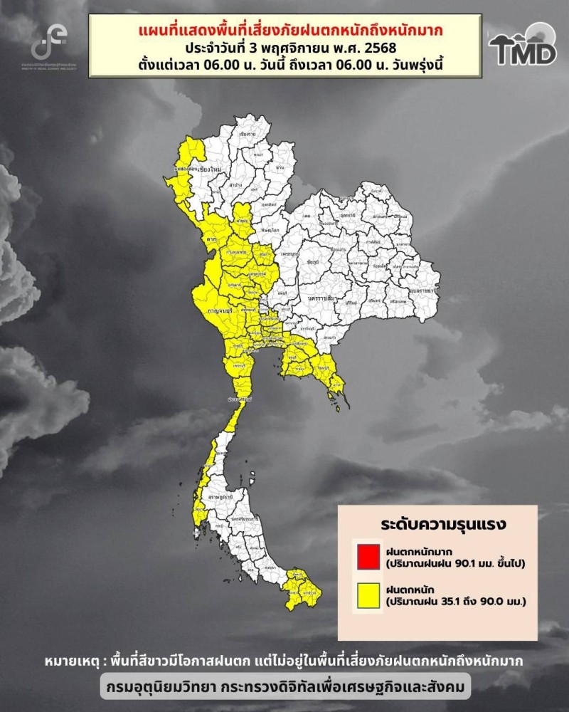 วันที่ 3 พ.ย. 2568 พยากรณ์อากาศ 24 ชั่วโมงข้างหน้า ประเทศไทยมีฝนตกหนักบางแห่ง โดยเฉพาะจังหวัด ตาก กำแพงเพชร นครสวรรค์ อุทัยธานี ชัยนาท กาญจนบุรี ราชบุรี สุพรรณบุรี นครปฐม และเพชรบุรี ส่วนภาคเหนือตอนบนและภาคตะวันออกเฉียงเหนือตอนบนยังคงมีอากาศเย็นในตอนเช้า ขอให้เกษตรกรเตรียมการป้องกันและระวังความเสียหายที่จะเกิดต่อผลผลิตทางการเกษตร รวมทั้งดูแลรักษาสุขภาพเนื่องจากสภาพอากาศที่เปลี่ยนแปลง และเพิ่มความระมัดระวังในการสัญจรผ่านบริเวณที่มีฝนตก รวมถึงระวังอันตรายจากฝนตกหนักซึ่งอาจทำให้เกิดน้ำท่วมได้ในบางพื้นที่