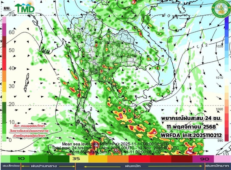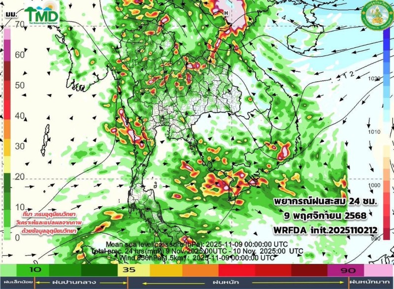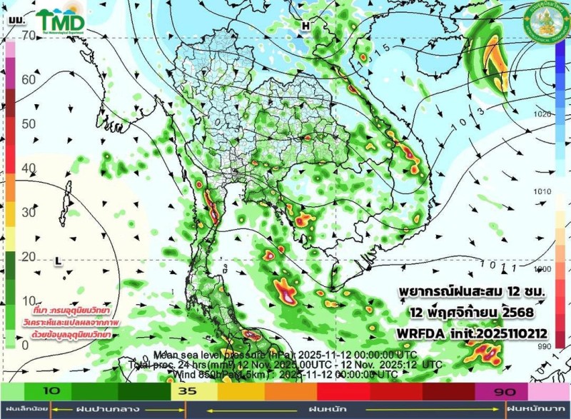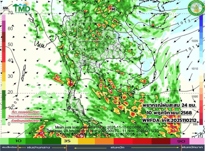 เมื่อวันที่ 3 พฤศจิกายน 2568 กรมอุตุนิยมวิทยา ได้รายงานอัปเดตการพยากรณ์ฝนสะสมรายวัน 10 วันล่วงหน้า ทุก 24 ชม. ตั้งแต่ 07.00 น. ถึง 07.00 น. วันรุ่งขึ้น ระหว่างวันที่ 3 - 12 พ.ย. 68 ข้อมูลจากแบบจำลอง TMD-WRFDA ของกรมอุตุนิยมวิทยา (init 2025110212) เฉดสีแสดงปริมาณฝน (มม.) → สีเขียว = ฝนเล็กน้อย / สีแดง = ฝนหนักมากกว่า 35.1 มม.