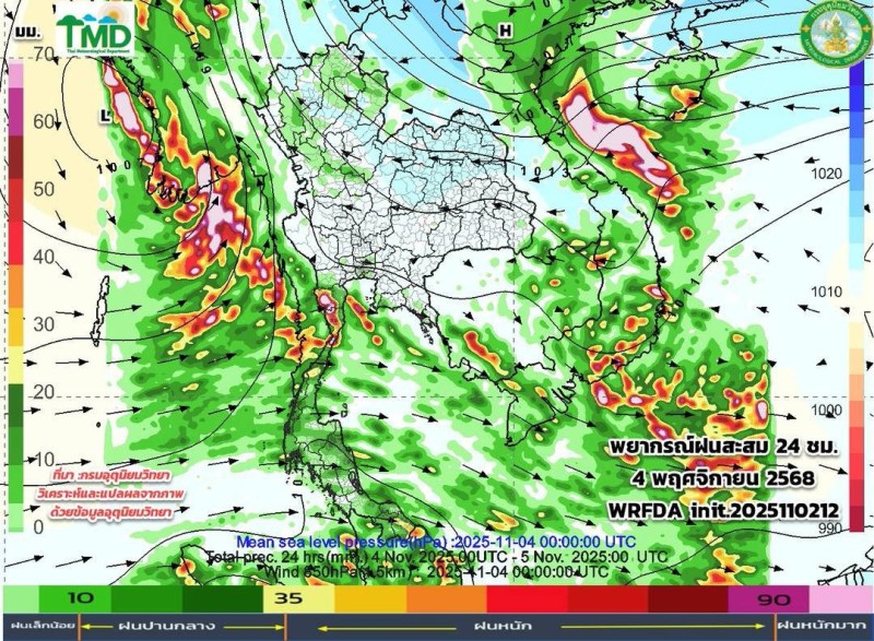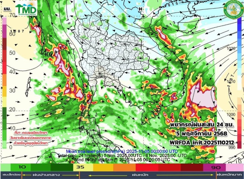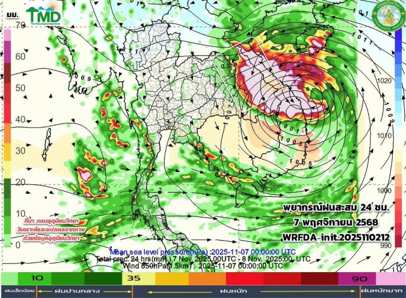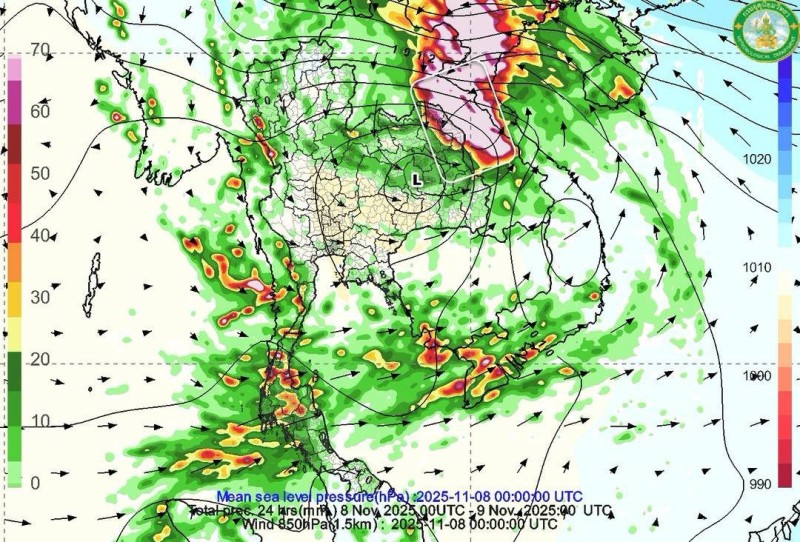 มวลอากาศเย็นกำลังปานกลางจะแผ่ลงมาปกคลุมประเทศไทยตอนบนอีกระลอก ฝนเริ่มลดลง แต่ยังคงมีตกบางแห่ง พายุโซนร้อน คัลแมกี (KALMAEGI) บริเวณมหาสมุทรแปซิฟิก (ตะวันออกของฟิลิปปินส์) คาดว่าจะเคลื่อนผ่านตอนกลางของประเทศฟิลิปปินส์ลงสู่ทะเลจีนใต้ และระหว่าง 6-8 พ.ย. 68 จะเคลื่อนเข้าใกล้ชายฝั่งเวียดนาม เมื่อปะทะมวลอากาศเย็นจะอ่อนกำลังลง แต่ยังต้องติดตามทิศทางและกำลังอย่างใกล้ชิด