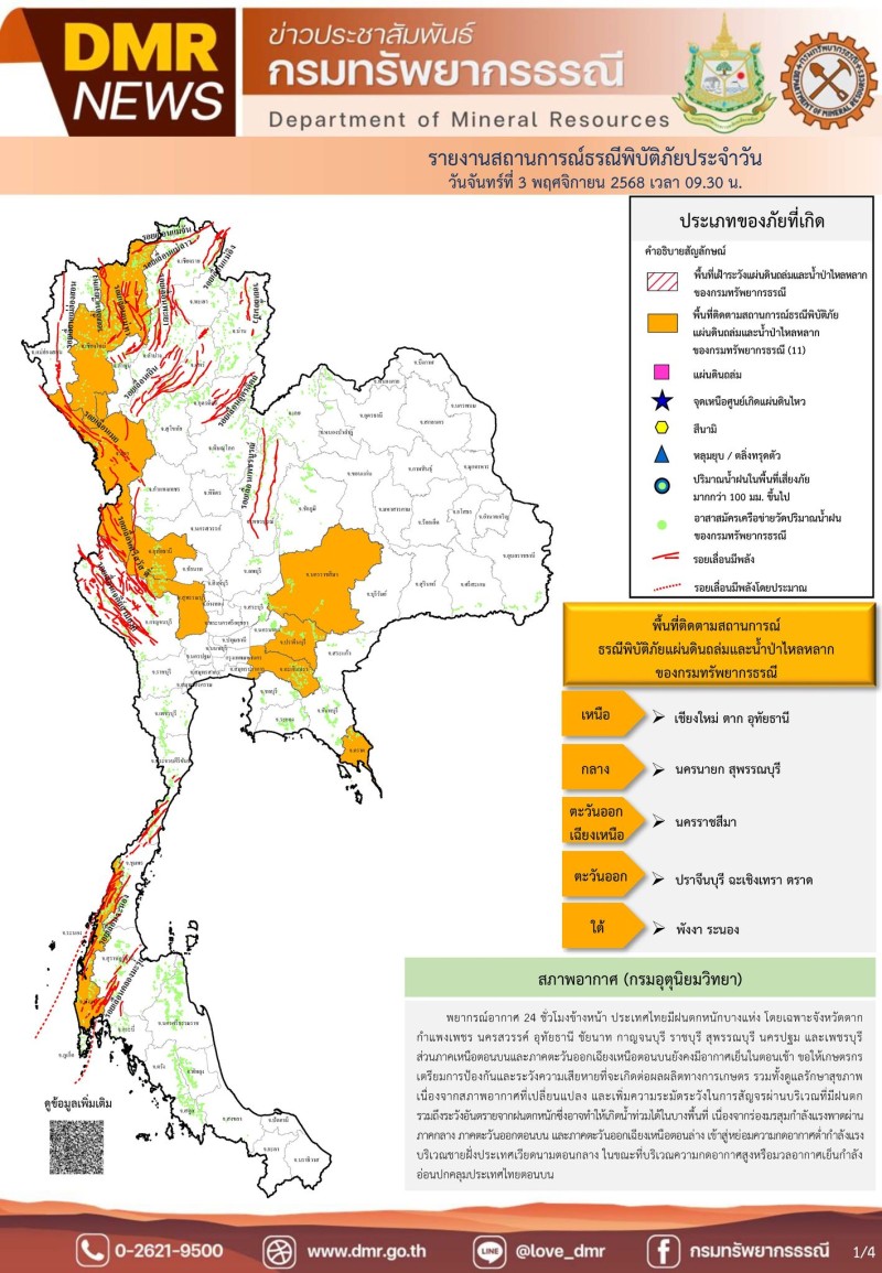เมื่อวันที่ 3 พฤศจิกายน 2568 ศูนย์ปฏิบัติการธรณีพิบัติภัย กองธรณีวิทยาสิ่งแวดล้อม กรมทรัพยากรธรณี กระทรวงทรัพยากรธรรมชาติและสิ่งแวดล้อม แจ้งเตือนให้ประชาชนเฝ้าระวังเหตุการณ์ดินถล่มและน้ำป่าไหลหลาก เนื่องจากพื้นที่เสี่ยงภัยแผ่นดินถล่มมีฝนตกหนักต่อเนื่อง