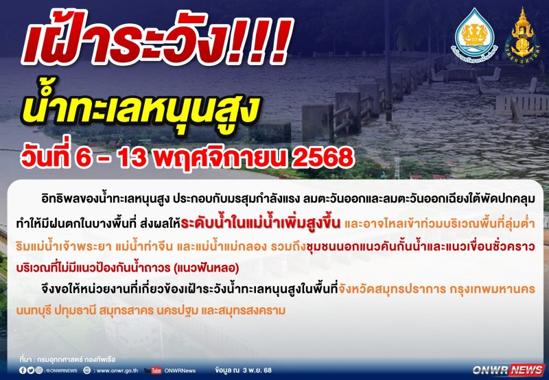 วันที่ 4 พฤศจิกายน 2568 สำนักงานทรัพยากรน้ำแห่งชาติ (สทนช.) แจ้งเตือน 7 จังหวัดพื้นที่ลุ่มต่ำริมแม่น้ำเจ้าพระยาให้เตรียมรับมือสถานการณ์น้ำทะเลหนุนสูง ระหว่างวันที่ 6 - 13 พฤศจิกายน 2568 ซึ่งจะส่งผลให้ระดับน้ำในแม่น้ำเพิ่มสูงและเอ่อล้นเข้าท่วมบางพื้นที่