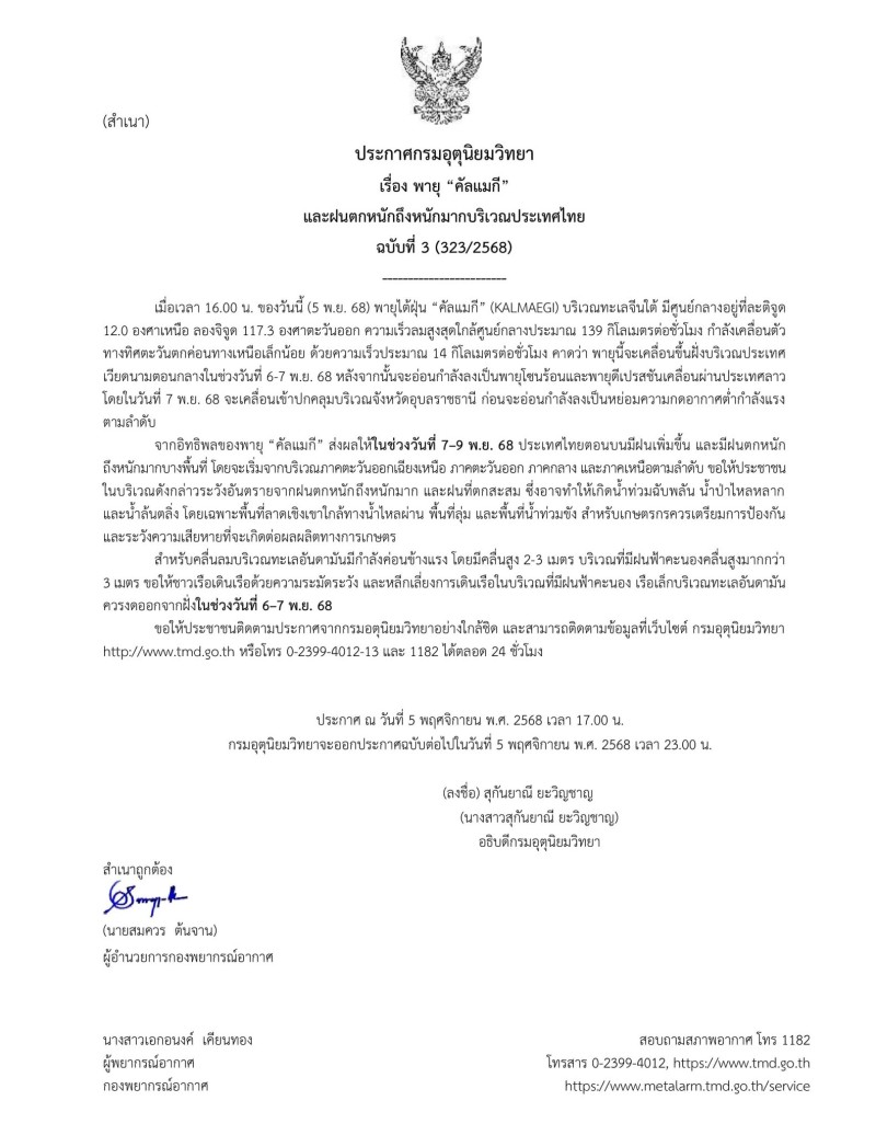 เมื่อวัน 5 พฤศจิกายน 2568 กรมอุตุนิยมวิทยา ประกาศ เรื่อง พายุคัลแมกี และฝนตกหนักถึงหนักมากบริเวณประเทศไทย ฉบับที่ 3 (323/2568)