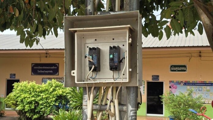 สนามเด็กเล่นตั้งอยู่ติดกับจุดตั้งเสาไฟส่องสว่าง โดยมีกล่องไฟที่ภายในมีเบรกเกอร์ติดอยู่กับเสาไฟจำนวน 2 ตัว สภาพเก่าทรุดโทรมและไม่มีฝาปิด