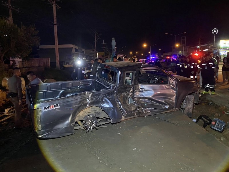 ที่เกิดเหตุพบรถกระบะ อีซูซุ ดีแม็กซ์ สีบรอนซ์เทา บล 5818 พิษณุโลก เสียหายรอบคัน รถกระบะ อีซูซุ ดีแม็กซ์ สีเทา ทะเบียน 3 ขต 8503 กรุงเทพฯ ด้านหน้าพังเสียหาย รถกระบะ นิสสัน นาวาร่า สีดำ ทะเบียน ผจ 7127 พิษณุโลก เสียหายด้านท้าย และรถจักรยานยนต์ ฮอนด้า เวฟ 125i สีเขียว-ดำ ทะเบียน 1 กส 6897 พิษณุโลก พังเสียหาย