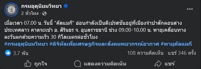 เมื่อเวลา 07.00 น. ของวันนี้ (7 พ.ย. 68) พายุ คัลแมกี (KALMAEGI) บริเวณบ้านหมากต้อง ประเทศลาว ได้อ่อนกำลังลงเป็นพายุดีเปรสชันแล้ว โดยมีศูนย์กลางอยู่ห่างประมาณ 50 กิโลเมตร ทางตะวันออกของอำเภอสิรินธร จังหวัดอุบลราชธานี หรือที่ละติจูด 15.0 องศาเหนือ ลองจิจูด 106.0 องศาตะวันออก ความเร็วลมสูงสุดใกล้ศูนย์กลางประมาณ 55 กิโลเมตรต่อชั่วโมง กำลังเคลื่อนตัวทางทิศตะวันตก ด้วยความเร็วประมาณ 35 กิโลเมตรต่อชั่วโมง คาดว่าพายุนี้จะเคลื่อนผ่าน ประเทศลาว และเข้าปกคลุมบริเวณอำเภอสิรินธร จังหวัดอุบลราชธานี ในช่วงก่อนเที่ยงของวันนี้ (7 พ.ย .68) ก่อนจะอ่อนกำลังลง เป็นหย่อมความกดอากาศต่ำกำลังแรงตามลำดับ