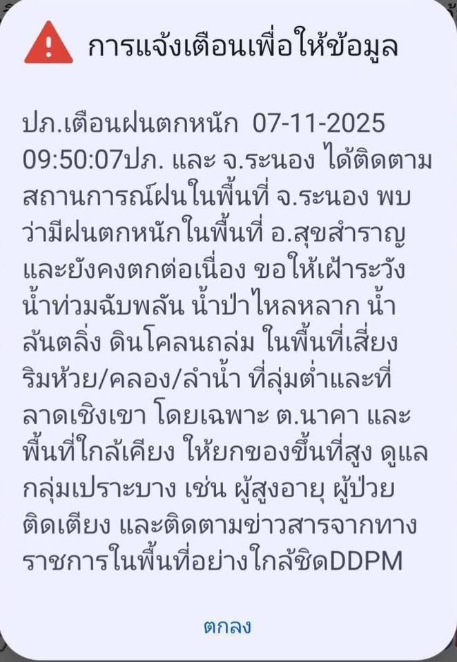 ปภ. จึงได้ร่วมกับผู้ให้บริการเครือข่ายโทรศัพท์เคลื่อนที่ AIS True และ NT ส่งข้อความแจ้งเตือนผ่าน Cell Broadcast แจ้งเตือนฝนตกหนัก อ.สุขสำราญ จ.ระนอง