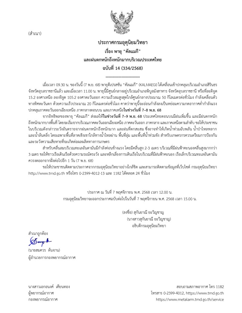 เมื่อวันที่ 7 พฤศจิกายน 2568 ศูนย์ประชาสัมพันธ์กรมอุตุนิยมวิทยา ประกาศกรมอุตุนิยมวิทยา เรื่อง พายุ คัลแมกี และฝนตกหนักถึงหนักมากบริเวณประเทศไทย ฉบับที่ 14 (334/2568) เมื่อเวลา 09.30 น. ของวันนี้ (7 พ.ย. 68) พายุดีเปรสชัน คัลเเมกี (KALMAEGI) ได้เคลื่อนเข้าปกคลุบริเวณอำเภอสิรินธร จังหวัดอุบลราชธานีแล้ว และเมื่อเวลา 11.00 น.