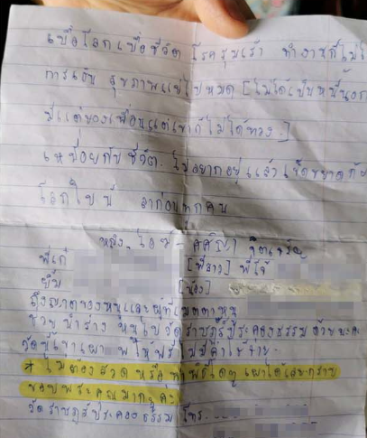 ท้ายจดหมาย เธอได้เขียนขอไว้กับญาติและผู้มีเมตตา ให้ช่วยนำร่างไปเผาที่วัดราษฎร์ประคองธรรม โดยไม่ต้องจัดพิธีใดๆ เพราะวัดนี้เผาให้ฟรี พร้อมระบุหมายเลขโทรศัพท์ติดต่อไว้ครบถ้วน
