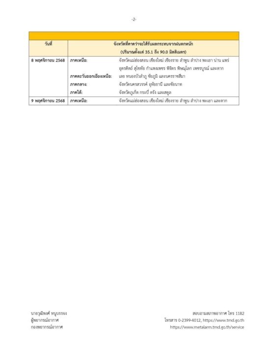 ขอให้ประชาชนติดตามประกาศจากกรมอุตุนิยมวิทยาอย่างใกล้ชิด และสามารถติดตามข้อมูลที่เว็บไซต์ กรมอุตุนิยมวิทยา http://www.tmd.go.th หรือโทร 0-2399-4012-13 และ 1182 ได้ตลอด 24 ชั่วโมง ประกาศ ณ วันที่ 8 พฤศจิกายน พ.ศ. 2568 เวลา 11.00 น. กรมอุตุนิยมวิทยาจะออกประกาศฉบับนี้เป็นฉบับสุดท้ายของเหตุการณ์นี้