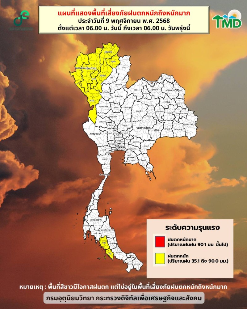 วันที่ 9 พ.ย. 2568 พยากรณ์อากาศ 24 ชั่วโมงข้างหน้า ภาคเหนือมีฝนตกหนักบางแห่ง โดยเฉพาะบริเวณจังหวัด แม่ฮ่องสอน เชียงใหม่ เชียงราย ลำพูน ลำปาง พะเยา และตาก เนื่องจากหย่อมความกดอากาศต่ำปกคลุมด้านตะวันตกของภาคเหนือและประเทศเมียนมา ขอให้ประชาชนในบริเวณดังกล่าวระวังอันตรายจากฝนตกหนักและฝนที่ตกสะสมซึ่งอาจทำให้เกิดน้ำท่วมฉับพลัน น้ำป่าไหลหลาก และน้ำล้นตลิ่ง โดยเฉพาะพื้นที่ลาดเชิงเขาใกล้ทางน้ำไหลผ่าน พื้นที่ลุ่ม และพื้นที่น้ำท่วมขัง ส่วนเกษตรกรควรป้องกันและระวังความเสียหายที่จะเกิดต่อผลผลิตทางการเกษตร