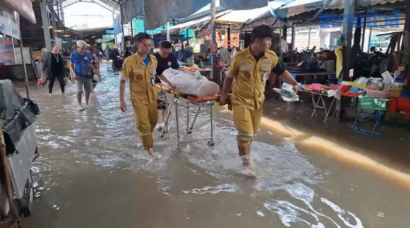 ที่เกิดเหตุ ทั้งตำรวจ กู้ภัยฯ แพทย์เวร ต้องเดินลุยน้ำเกือบครึ่งหน้าแข้งเข้าไปตรวจสอบ บริเวณภายในจุดจอดรับ-ฝาก รถจักรยานยนต์พบร่าง นายสมาน ด้วงชื่น อายุ 77 ปี ชาว ต.ปากคลองบางปลากด อ.พระสมุทรเจดีย์ จ.สมุทรปราการ นอนหงายอยู่บนเก้าอี้ไม้ สภาพศพสวมเสื้อยืดคอกลม แขนสั้นสีน้ำตาล สวมกางเกงขาสั้นสีน้ำตาลเข้ม เนื้อตัวเปียกชุ่มไปด้วยน้ำ เจ้าหน้าที่จึงบันทึกภาพพร้อมลงบันทึกประจำวันไว้เบื้องต้น