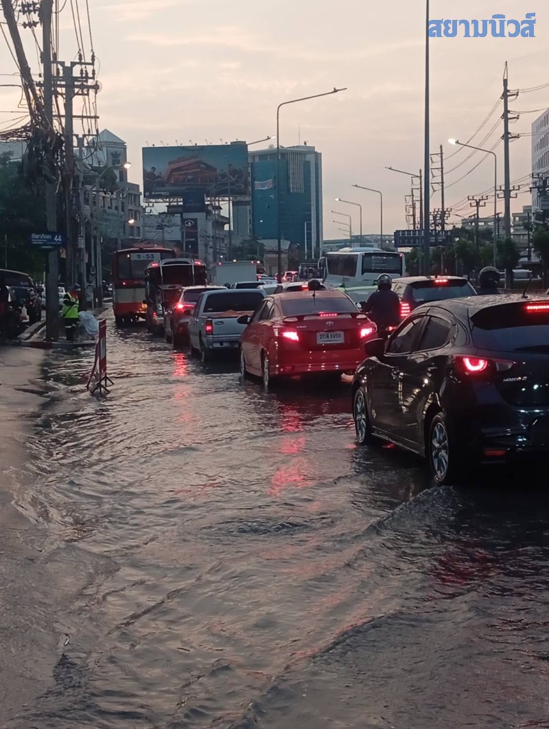 ในขณะที่ เมื่อเวลา 06.00 น. สภาพการจราจรถนนพหลโยธินช่วงแยกเกษตรถึงแยกรัชโยธิน การจราจรติดขัดสะสมจากแยกรัชโยธินที่มีน้ำท่วมขัง