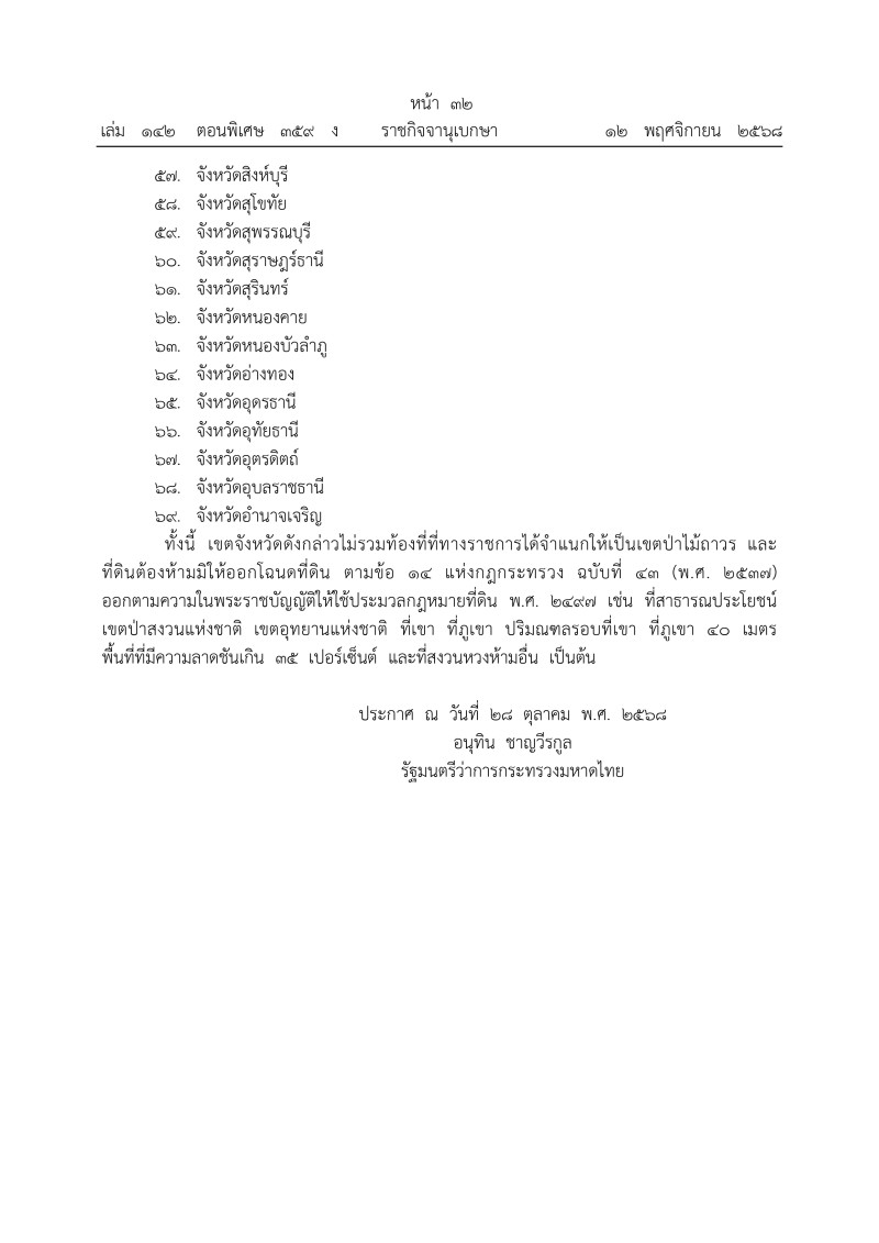 ประกาศ ณ วันที่ 28 ตุลาคม 2568 โดยมีนายอนุทิน ชาญวีรกูล รัฐมนตรีว่าการกระทรวงมหาดไทย เป็นผู้ลงนาม