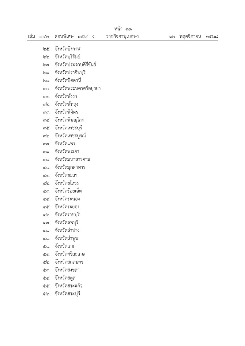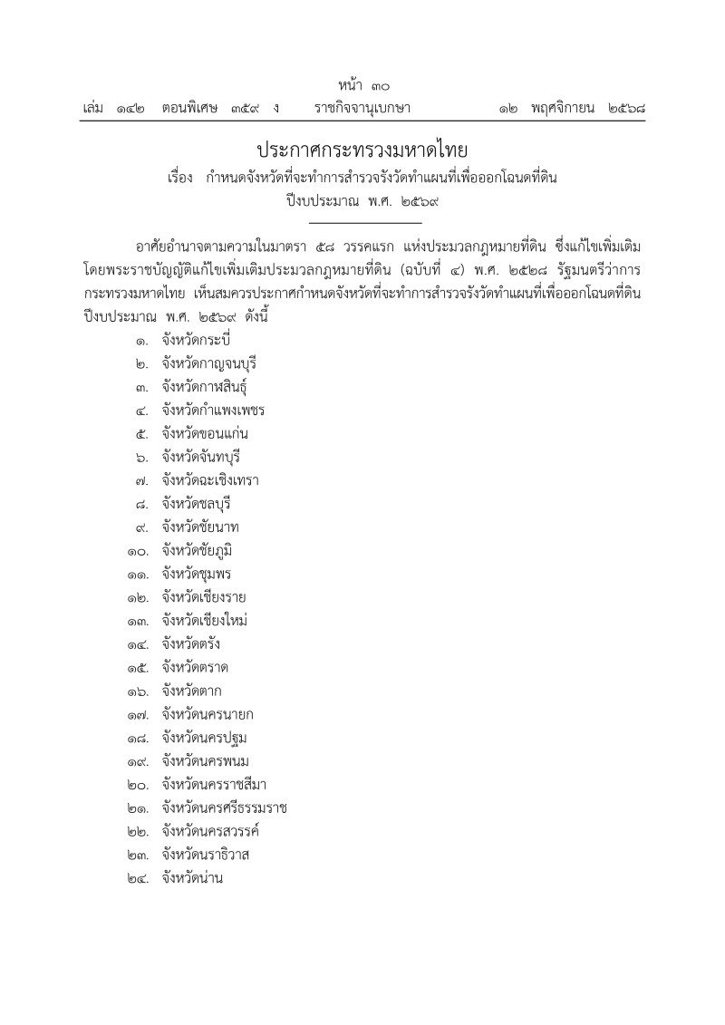 เมื่อวันที่ 13 พฤศจิกายน 2568 มีรายงานว่า เว็บไซต์ ราชกิจจานุเบกษา เผยเเพร่ ประกาศกระทรวงมหาดไทย เรื่อง กำหนดจังหวัดที่จะทำการสำรวจรังวัดทำแผนที่เพื่อออกโฉนดที่ดิน ปีงบประมาณ พ.ศ. 2569