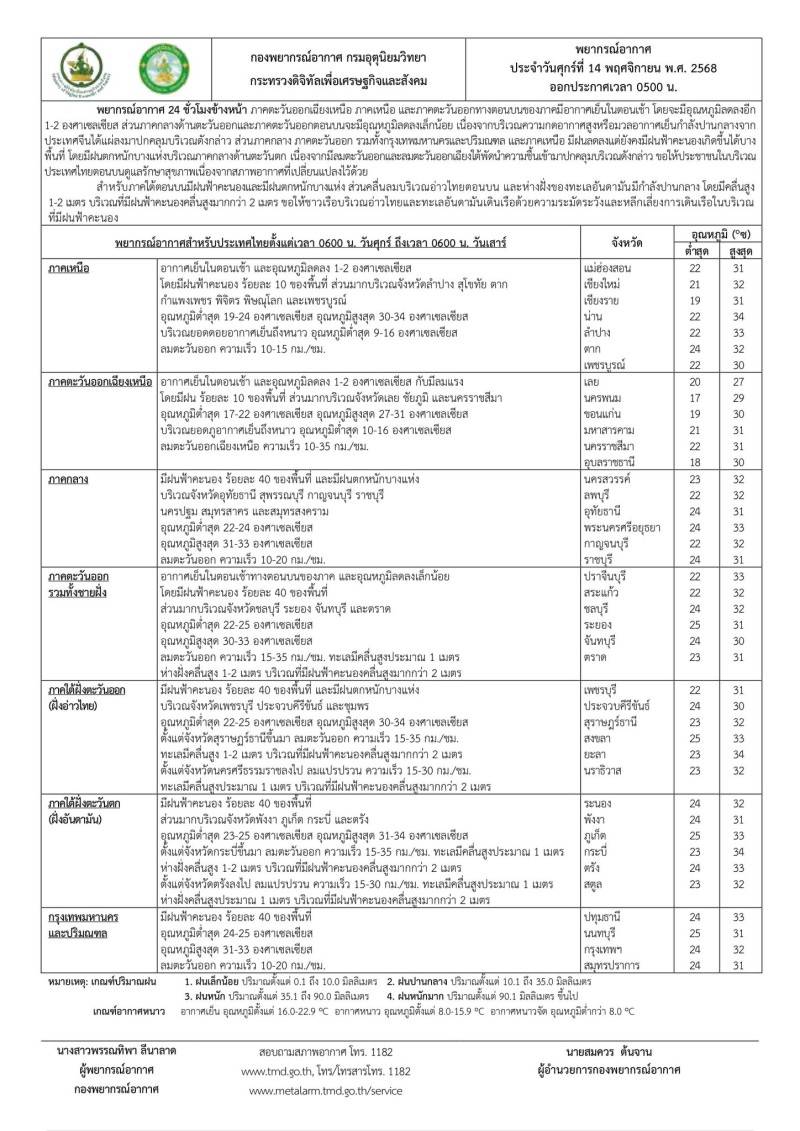 วันที่ 14 พฤศจิกายน 2568 กรมอุตุนิยมวิทยา พยากรณ์อากาศ 24 ชั่วโมงข้างหน้า ภาคตะวันออกเฉียงเหนือ ภาคเหนือ และภาคตะวันออกทางตอนบนของภาคมีอากาศเย็นในตอนเช้า โดยจะมีอุณหภูมิลดลงอีก 1-2 องศาเซลเซียส ส่วนภาคกลางด้านตะวันออกและภาคตะวันออกตอนบนจะมีอุณหภูมิลดลงเล็กน้อย