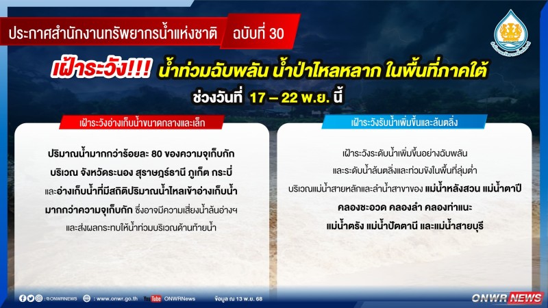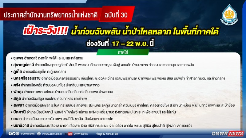 เมื่อวันที่ 14 พฤศจิกายน 2568 สำนักงานทรัพยากรน้ำแห่งชาติ ได้แถลงการณ์ ประกาศ ฉบับที่ 30/2568 เรื่อง เฝ้าระวังน้ำท่วมฉับพลัน น้ำป่าไหลหลาก ในพื้นที่ภาคใต้