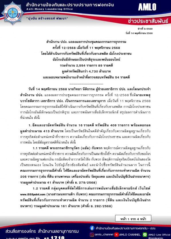 นายวิทยา นีติธรรม ผู้ช่วยเลขาธิการ ปปง. และโฆษกประจำสำนักงาน ปปง. แถลงผลการประชุมคณะกรรมการธุรกรรม ครั้งที่ 12/2568 ซึ่งมีนายเทพสุ บวรโชติดารา เลขาธิการ ปปง. เป็นกรรมการและเลขานุการ เมื่อวันที่ 11 พฤศจิกายน 2568 โดยคณะกรรมการธุรกรรมมีมติให้ดำเนินการกับทรัพย์สิน พระธรรมวชิรานุวัตร (แย้ม) กับพวก