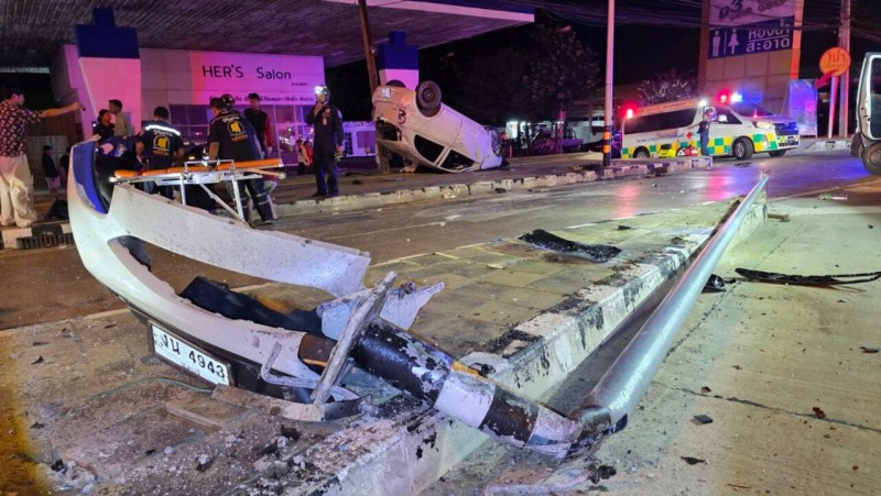 เมื่อวันที่ 17 พ.ย. 2568 พ.ต.ท.สินสมุทร บุญทัศนา สารวัตรสอบสวน สภ.สัตหีบ ได้รับแจ้งเกิดอุบัติเหตุรถเก๋งแหกโค้ง เสียหลักพุ่งชนเสาไฟส่องสว่างพลิกคว่ำ มีผู้ได้รับบาดเจ็บและเสียชีวิตหลายราย เหตุเกิดบนถนนสุขุมวิท เส้นทางขาเข้าพัทยา บริเวณแยกหนวดปลาหมึก (แยกสัตหีบ) หน้าปั๊มบางจาก ปากทางเข้าหน่วยบัญชาการนาวิกโยธิน ต.สัตหีบ อ.สัตหีบ จ.ชลบุรี หลังรับแจ้ง จึงพร้อมด้วยหน่วยกู้ภัยมูลนิธิสว่างโรจนธรรมสถานสัตหีบ รุดไปตรวจสอบ
