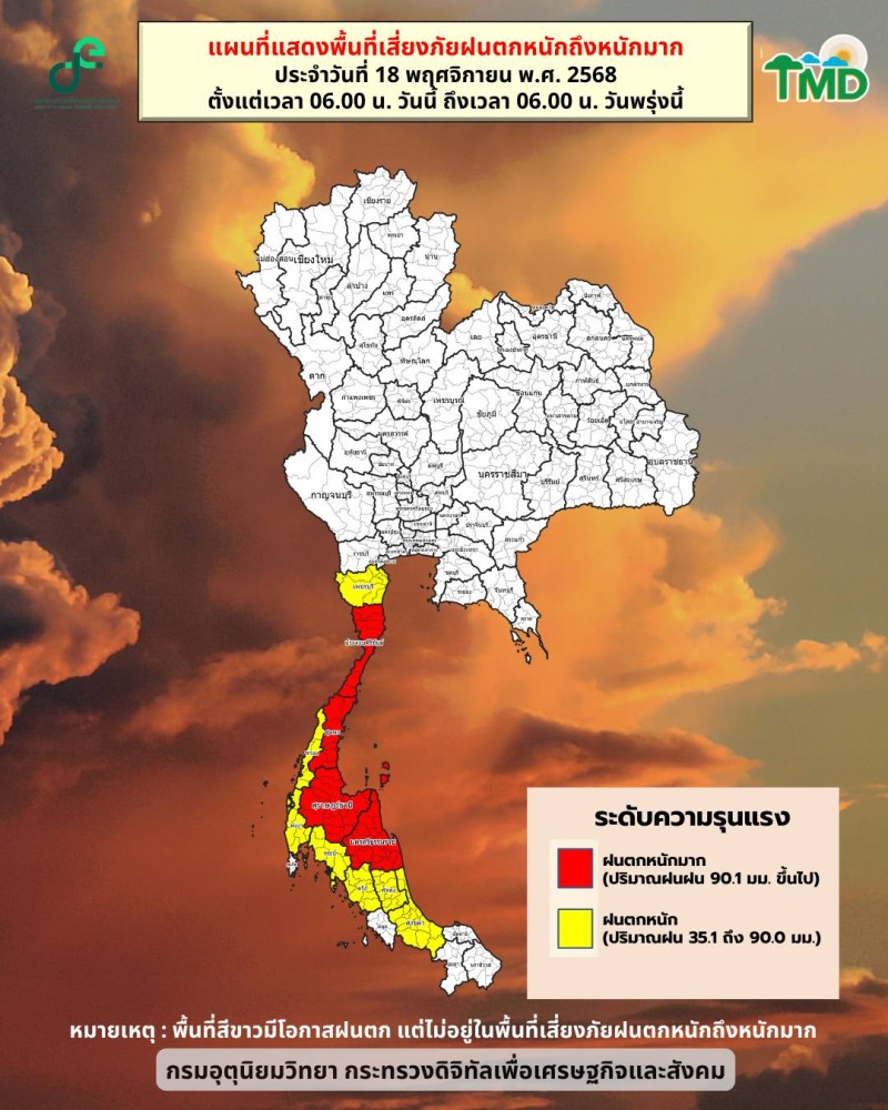 พยากรณ์อากาศ 24 ชั่วโมงข้างหน้า ประเทศไทยตอนบนยังคงมีอากาศแปรปรวน โดยมีฝนบางพื้นที่ในระยะแรก หลังจากนั้นในช่วงวันที่ 19 - 20 พ.ย. 68 อุณหภูมิจะลดลง กับมีลมแรงโดยภาคตะวันออกเฉียงเหนือ อุณหภูมิจะลดลง 3-5 องศาเซลเซียส ส่วนภาคเหนือ ภาคกลาง รวมทั้งกรุงเทพมหานครและปริมณฑล และภาคตะวันออก อุณหภูมิจะลดลง 1-3 องศาเซลเซียส ขอให้ประชาชนในบริเวณดังกล่าวดูแลรักษาสุขภาพเนื่องจากสภาพอากาศที่เปลี่ยนแปลง ส่วนเกษตรกรควรเตรียมการป้องกันและระวังความเสียหายที่จะเกิดต่อผลผลิตทางการเกษตรไว้ด้วย ทั้งนี้เนื่องจากบริเวณความกดอากาศสูงหรือมวลอากาศเย็นกำลังแรงระลอกใหม่จากประเทศจีนได้แผ่ลงมาปกคลุมภาคตะวันออกเฉียงเหนือตอนบน และทะเลจีนใต้แล้ว คาดว่าจะแผ่ปกคลุมประเทศไทยตอนบนในวันนี้ (18 พ.ย. 68) ในขณะที่ยังคงมีลมฝ่ายตะวันออกพัดนำความชื้นเข้ามาปกคลุมประเทศไทยตอนบน