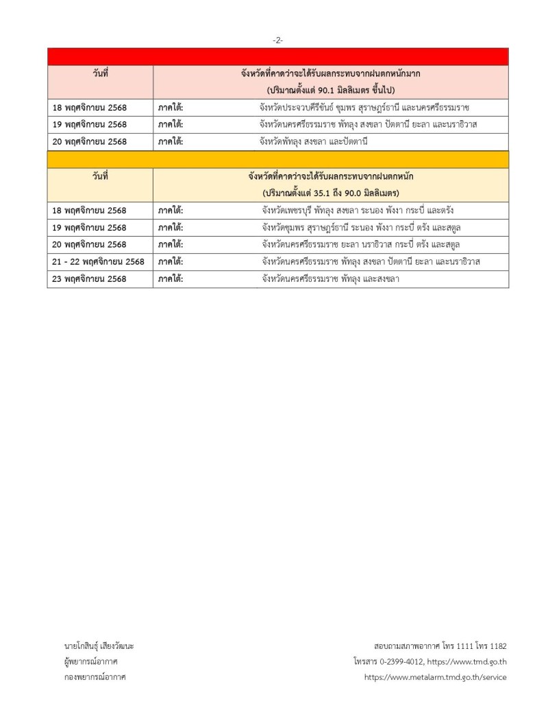 สำหรับภาคใต้มีฝนตกหนักถึงหนักมากบางแห่ง เนื่องจากมรสุมตะวันออกเฉียงเหนือกำลังปานกลางที่พัดปกคลุมอ่าวไทย ภาคใต้ และทะเลอันดามันตอนบนเริ่มมีกำลังแรงขึ้น ขอให้ประชาชนในภาคใต้ระวังอันตรายจากฝนตกหนักถึงหนักมากและฝนที่ตกสะสม ซึ่งอาจทำให้เกิดน้ำท่วมฉับพลันและน้ำป่าไหลหลาก โดยเฉพาะพื้นที่ลาดเชิงเขาใกล้ทางน้ำไหลผ่านและพื้นที่ลุ่มไว้ด้วย