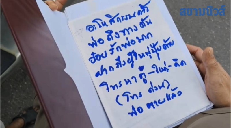 ที่เกิดเหตุ เป็นบ้านครึ่งไม้ครึ่งปูน 2 ชั้น พบชาวบ้านยืนมุงอยู่รอบๆ จากการตรวจสอบ พบศพนายบุญส่ง อายุ 88 ปี ใช้เชือกไนล่อนสีแดง ผูกคอเสียชีวิตที่ขื่อแปรติดกับหลังคา อยู่ในสภาพชันเข่าลงอยู่กับพื้น สภาพลำตัวยังอ่อนอยู่ บนเตียงนอนไม้พบจดหมายของผู้เสียชีวิตเขียนไว้อยู่ 1 แผ่น ระบุใจความประมาณว่า อโหสิกรรมด้วย พ่อถึงทางตัน อ๋อยรักพ่อมาก ฝากถึงผู้ใหญ่ปุ้ยด้วย โทรหาตู้-ใหญ่-คิด โทรด่วน พ่อเสียแล้ว จนท.ตำรวจจึงได้เก็บไว้เป็นหลักฐาน
