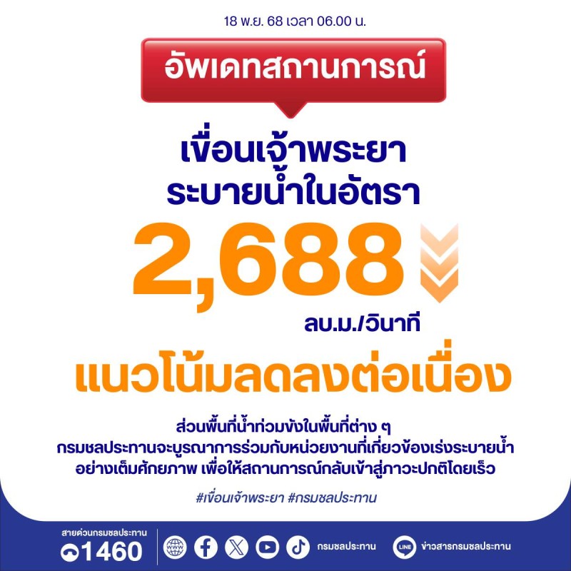 เมื่อวันที่ 18 พฤศจิกายน 2568 ศูนย์ประชาสัมพันธ์กรมชลประทาน ได้รายงานสถานการณ์น้ำเจ้าพระยา ประจำวันที่ 18 พฤศจิกายน 2568 ณ เวลา 06.00 น. ผ่านเพจเฟซบุ๊ก กรมชลประทาน โดยระบุว่า ปริมาณน้ำทางตอนบน ยังคงลดลงอย่างต่อเนื่อง ทำให้ที่ สถานี C.2 อ.เมือง จ.นครสวรรค์ ปริมาณน้ำไหลผ่าน 2,868 ลบ.ม./วินาที (วานนี้ 2,931 ลบ.ม./วินาที) ระดับน้ำ 24.62 ม. (ต่ำกว่าตลิ่ง 1.08 ม.) แนวโน้มลดลงต่อเนื่อง