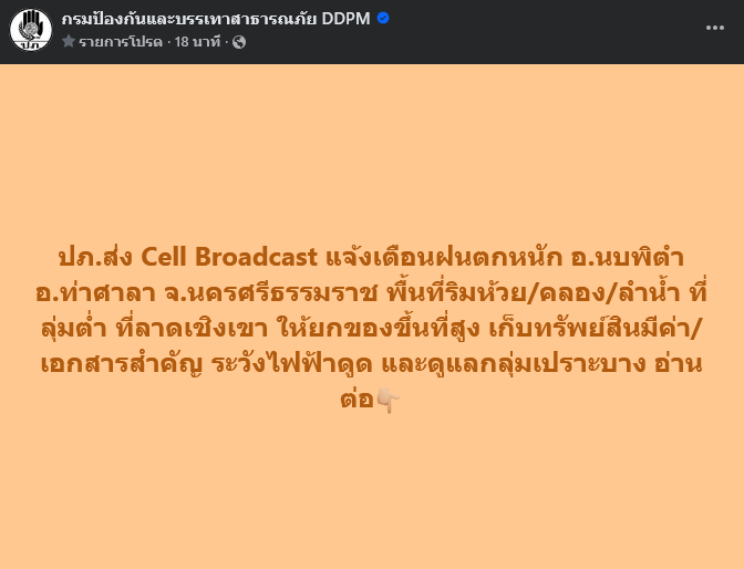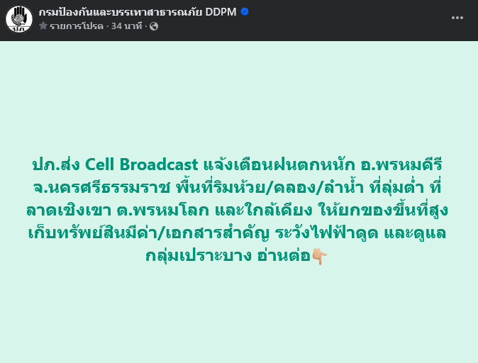 ปภ. จึงได้ร่วมกับผู้ให้บริการเครือข่ายโทรศัพท์เคลื่อนที่ AIS True และ NT ส่งข้อความแจ้งเตือนผ่าน Cell Broadcast แจ้งเตือนฝนตกหนัก อ.พรหมคีรี อ.นบพิตำ อ.ท่าศาลา จ.นครศรีธรรมราช