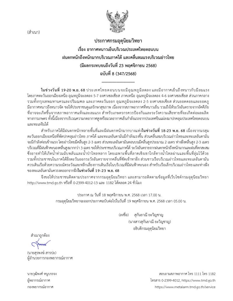 เมื่อวันที่ 18 พฤศจิกายน 2568 ศูนย์ประชาสัมพันธ์กรมอุตุนิยมวิทยา ประกาศกรมอุตุนิยมวิทยา เรื่อง อากาศหนาวเย็นบริเวณประเทศไทยตอนบน ฝนตกหนักถึงหนักมากบริเวณภาคใต้ และคลื่นลมแรงบริเวณอ่าวไทย (มีผลกระทบจนถึงวันที่ 23 พฤศจิกายน 2568) ฉบับที่ 8 (347/2568)