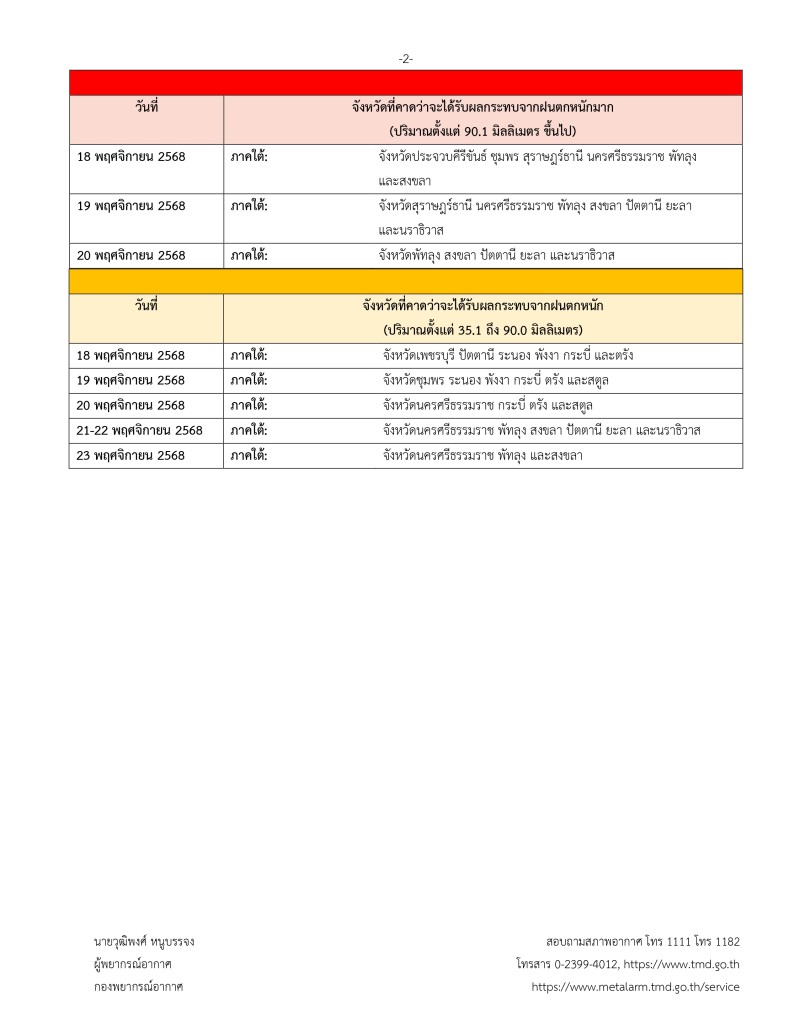 สำหรับภาคใต้มีฝนตกหนักหลายพื้นที่และมีฝนตกหนักมากบางแห่งในช่วงวันที่ 18-23 พ.ย. 68 เนื่องจากมรสุมตะวันออกเฉียงเหนือที่พัดปกคลุมอ่าวไทย ภาคใต้ และทะเลอันดามันมีกำลังแรงขึ้น ส่วนคลื่นลมบริเวณอ่าวไทยและทะเลอันดามันจะมีกำลังค่อนข้างแรง โดยอ่าวไทยมีคลื่นสูง 2-3 เมตร ส่วนทะเลอันดามันตอนบนมีคลื่นสูงประมาณ 2 เมตร ห่างฝั่งคลื่นสูง 2-3 เมตร บริเวณที่มีฝนฟ้าคะนองคลื่นสูงมากกว่า 3 เมตร