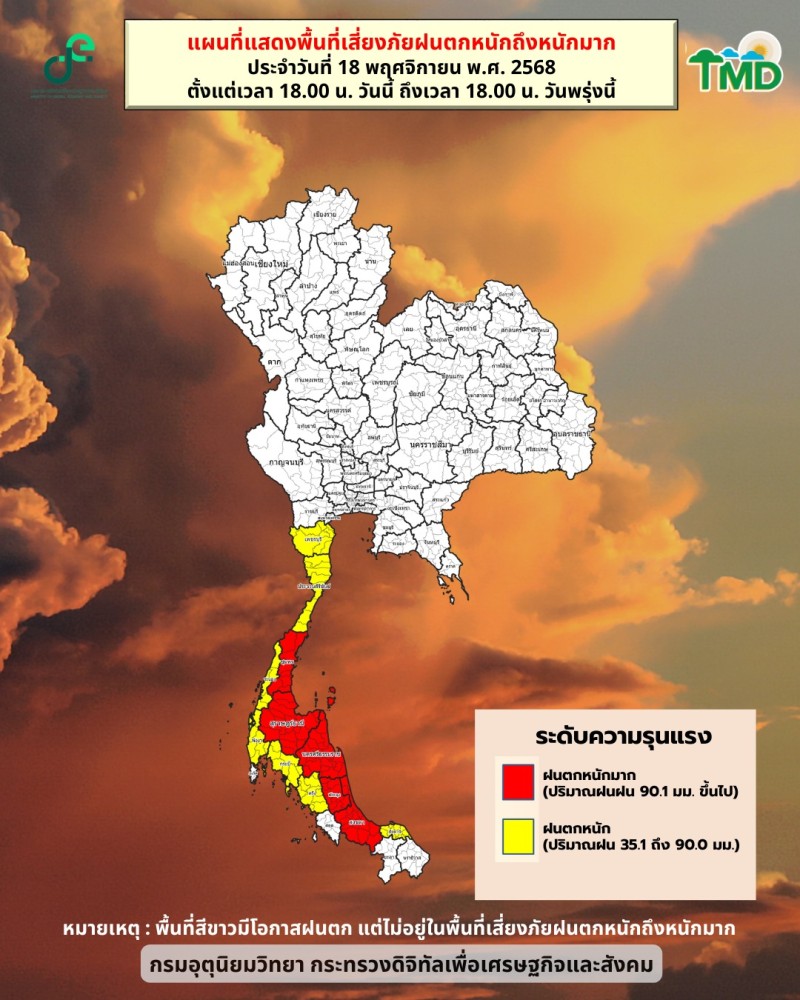 สำหรับภาคใต้มีฝนตกหนักหลายพื้นที่และมีฝนตกหนักมากบางแห่ง เนื่องจากมรสุมตะวันออกเฉียงเหนือที่พัดปกคลุมอ่าวไทย ภาคใต้ และทะเลอันดามันตอนบนมีกำลังแรงขึ้น ขอให้ประชาชนในภาคใต้ระวังอันตรายจากฝนตกหนักถึงหนักมากและฝนที่ตกสะสม ซึ่งอาจทำให้เกิดน้ำท่วมฉับพลันและน้ำป่าไหลหลาก โดยเฉพาะพื้นที่ลาดเชิงเขาใกล้ทางน้ำไหลผ่านและพื้นที่ลุ่มไว้ด้วย
