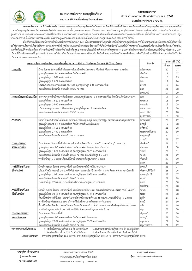 วันที่ 18 พฤศจิกายน 2568 กรมอุตุนิยมวิทยา พยากรณ์อากาศ 24 ชั่วโมงข้างหน้า ประเทศไทยตอนบนจะมีอุณหภูมิลดลงกับมีลมแรง แต่ยังคงมีฝนบางพื้นที่ โดยภาคตะวันออกเฉียงเหนือ อุณหภูมิจะลดลง 3-5 องศาเซลเซียส ภาคเหนือ อุณหภูมิจะลดลง 2-4 องศาเซลเซียส ส่วนภาคกลาง รวมทั้งกรุงเทพมหานครและปริมณฑล และภาคตะวันออก อุณหภูมิจะลดลง 1-3 องศาเซลเซียส
