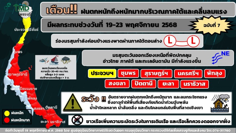 เมื่อวันที่ 19 พฤศจิกายน 2568 ศูนย์ปฏิบัติการน้ำอัจฉริยะ (SWOC) กรมชลประทาน เปิดเผยว่า อิทธิพลของร่องมรสุมกำลังค่อนข้างแรงพาดผ่านภาคใต้ตอนล่าง ร่วมกับมรสุมตะวันออกเฉียงเหนือที่มีกำลังแรงขึ้น ส่งผลให้หลายจังหวัดในพื้นที่ภาคใต้ เกิดฝนตกหนักถึงหนักมาก กรมอุตุนิยมวิทยา คาดว่าจะมีผลกระทบอย่างต่อเนื่องไปจนถึงวันที่ 23 พฤศจิกายน 2568