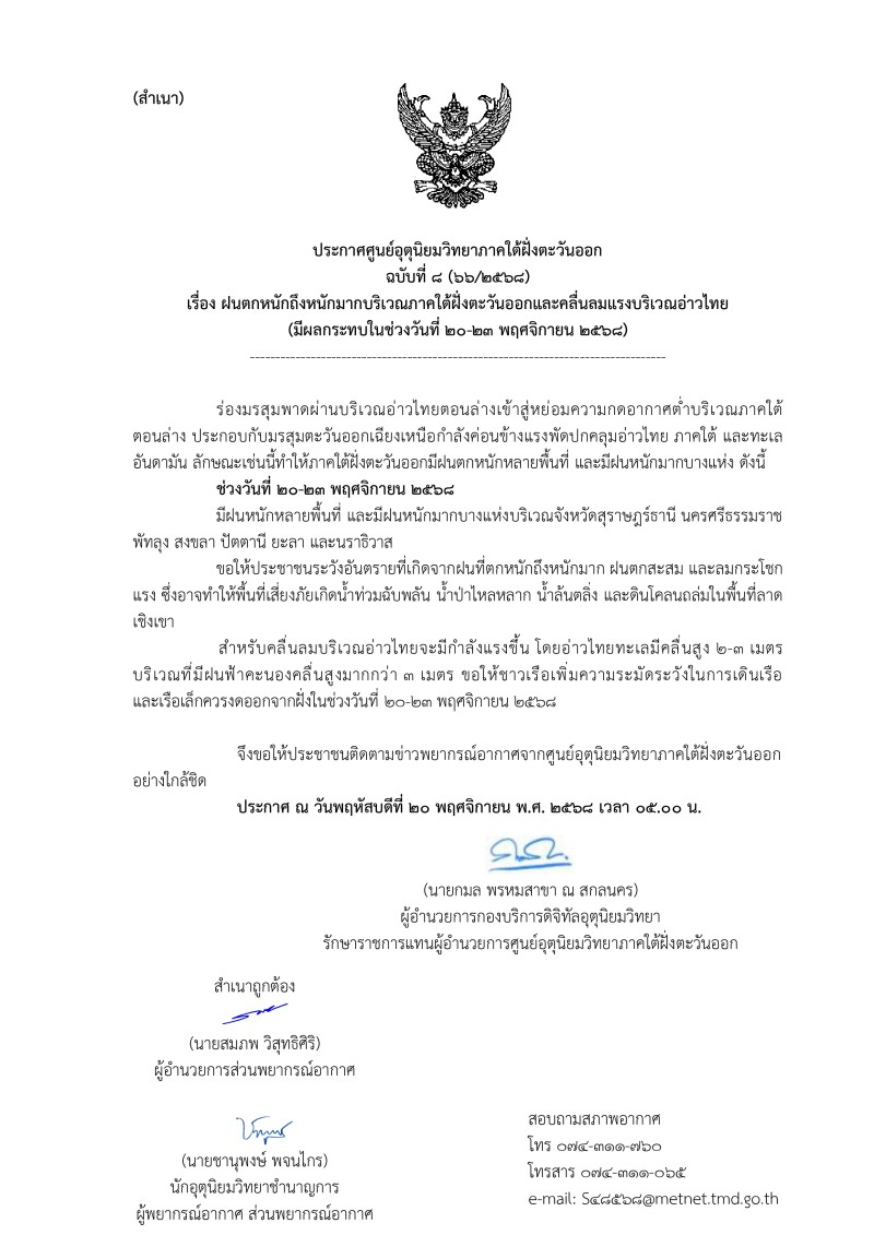 เมื่อวันที่ 20 พฤศจิกายน 2568 ศูนย์อุตุนิยมวิทยาภาคใต้ฝั่งตะวันออก เผยเเพร่ ประกาศศูนย์อุตุนิยมวิทยาภาคใต้ฝั่งตะวันออก ประกาศเตือนฉบับที่ 8 (66/2568) เรื่อง ฝนตกหนักถึงหนักมากบริเวณภาคใต้ฝั่งตะวันออกและคลื่นลมแรงบริเวณอ่าวไทย (มีผลกระทบในช่วงวันที่ 20-23 พฤศจิกายน 2568) โดยระบุว่า ร่องมรสุมพาดผ่านบริเวณอ่าวไทยตอนล่างเข้าสู่หย่อมความกดอากาศต่ำบริเวณภาคใต้ตอนล่าง ประกอบกับมรสุมตะวันออกเฉียงเหนือกำลังค่อนข้างแรงพัดปกลุมอ่าวไทย ภาคใต้ และทะเลอันดามัน ลักษณะเช่นนี้ทำให้ภาคใต้ฝั่งตะวันออกมีฝนตกหนักหลายพื้นที่ และมีฝนหนักมากบางแห่ง ดังนี้