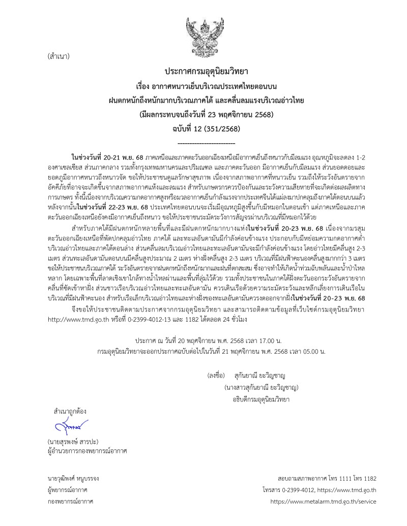 เมื่อวันที่ 20 พฤศจิกายน 2568 ศูนย์ประชาสัมพันธ์กรมอุตุนิยมวิทยา ประกาศกรมอุตุนิยมวิทยา เรื่อง อากาศหนาวเย็นบริเวณประเทศไทยตอนบน ฝนตกหนักถึงหนักมากบริเวณภาคใต้ และคลื่นลมแรงบริเวณอ่าวไทย (มีผลกระทบจนถึงวันที่ 23 พฤศจิกายน 2568) ฉบับที่ 12 (351/2568)