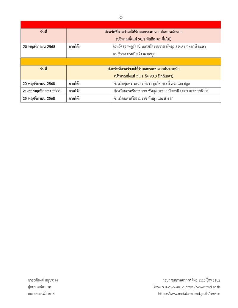 สำหรับภาคใต้มีฝนตกหนักหลายพื้นที่และมีฝนตกหนักมากบางแห่งในช่วงวันที่ 20-23 พ.ย. 68 เนื่องจากมรสุมตะวันออกเฉียงเหนือที่พัดปกคลุมอ่าวไทย ภาคใต้ และทะเลอันดามันมีกำลังค่อนข้างแรง ประกอบกับมีหย่อมความกดอากาศต่ำบริเวณอ่าวไทยและภาคใต้ตอนล่าง ส่วนคลื่นลมบริเวณอ่าวไทยและทะเลอันดามันจะมีกำลังค่อนข้างแรง โดยอ่าวไทยมีคลื่นสูง 2-3 เมตร ส่วนทะเลอันดามันตอนบนมีคลื่นสูงประมาณ 2 เมตร ห่างฝั่งคลื่นสูง 2-3 เมตร บริเวณที่มีฝนฟ้าคะนองคลื่นสูงมากกว่า 3 เมตร