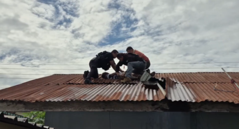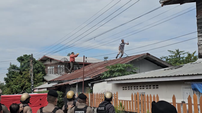 ทันทีที่เห็นตำรวจ นายดำถือมีดพร้าพร้อมxีดปลายแหลม กระโดดหนีขึ้นไปบนหลังคาบ้าน และไม่ยอมลงมา เจ้าหน้าที่ต้องปิดล้อมพื้นที่ พร้อมพยายามเกลี้ยกล่อมอย่างต่อเนื่อง ท่ามกลางชาวบ้านที่มามุงดูจำนวนมาก ทั้งยังพบว่าเจ้าตัวได้ดัดแปลงสายไฟเปลือยพันลูกบิดประตู เพื่อป้องกันไม่ให้ใครเข้าไปภายในบ้าน