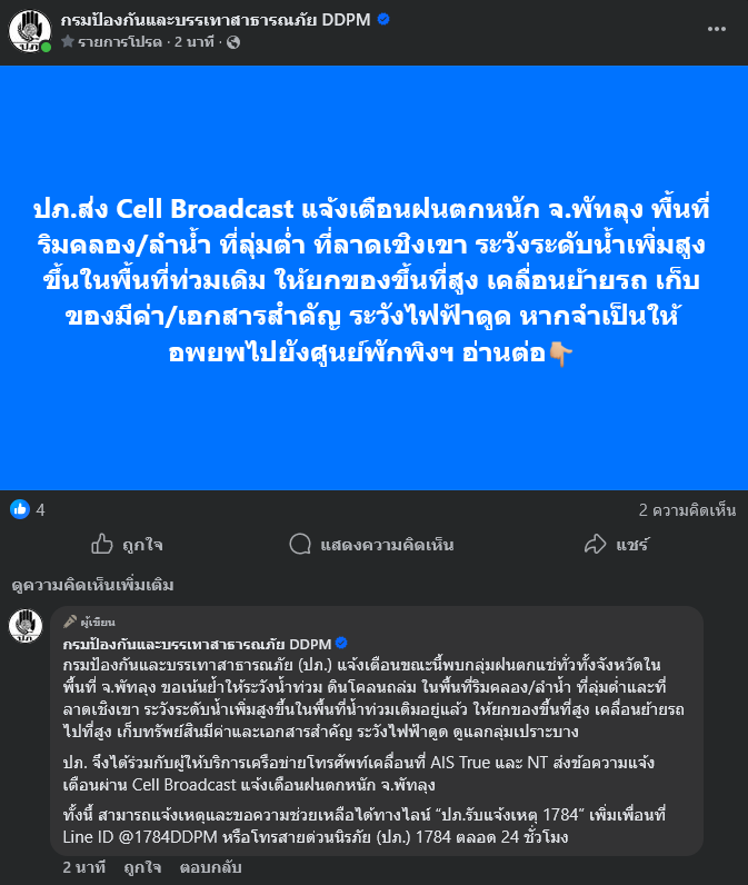 ปภ. จึงได้ร่วมกับผู้ให้บริการเครือข่ายโทรศัพท์เคลื่อนที่ AIS True และ NT ส่งข้อความแจ้งเตือนผ่าน Cell Broadcast แจ้งเตือนฝนตกหนัก จ.พัทลุง