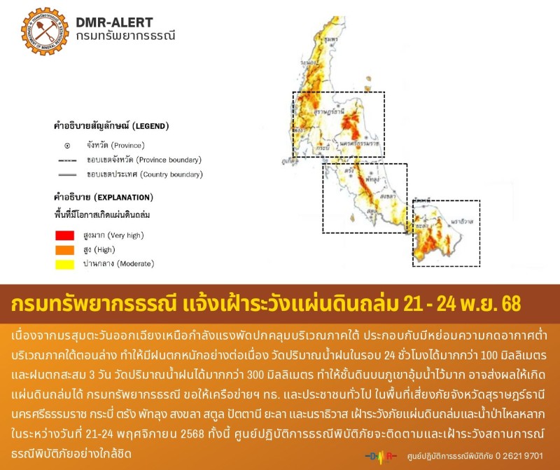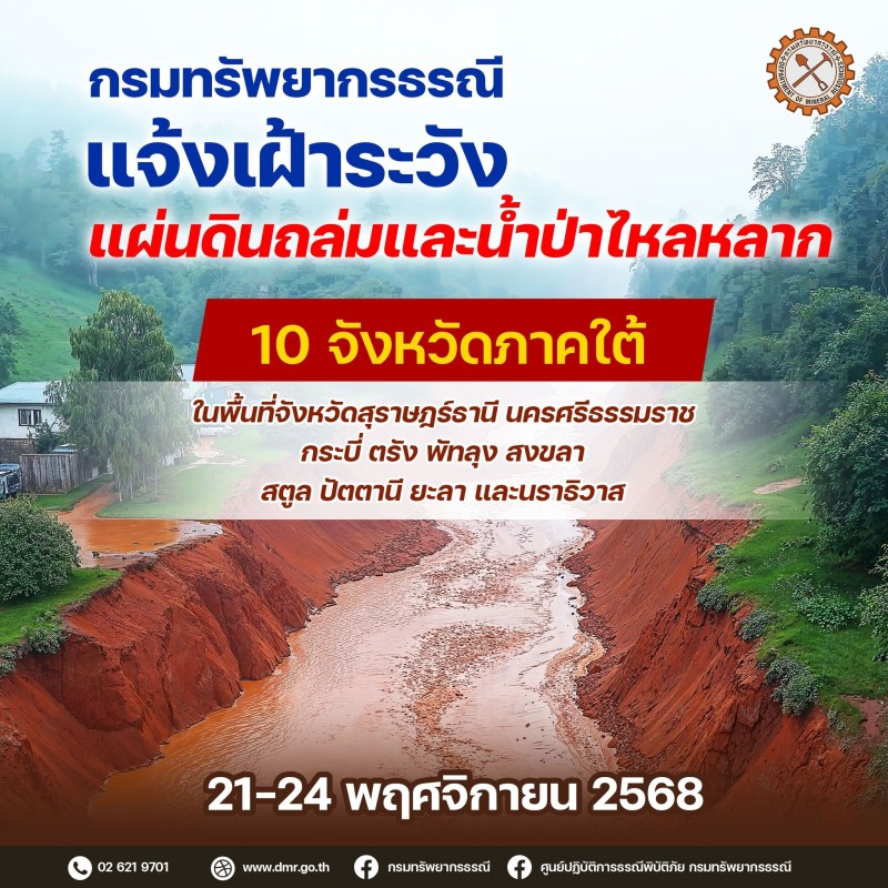 วันที่ 22 พฤศจิกายน 2568 กรมทรัพยากรธรณี ประกาศแจ้งเฝ้าระวังแผ่นดินถล่ม ระหว่างวันที่ 22-24 พฤศจิกายน 2568 ขอให้อาสาสมัครเครือข่ายในพื้นที่จังหวัดสุราษฎร์ธานี นครศรีธรรมราช กระบี่ ตรัง พัทลุง สงขลา สตูล ปัตตานี ยะลา และนราธิวาส เฝ้าระวังภัยแผ่นดินถล่มและน้ำป่าไหลหลาก พร้อมขอให้เครือข่ายฯ วัดปริมาณน้ำฝนอย่างต่อเนื่อง ขณะที่ศูนย์ปฏิบัติการธรณีพิบัติภัย จะติดตามสถานการณ์อย่างใกล้ชิด