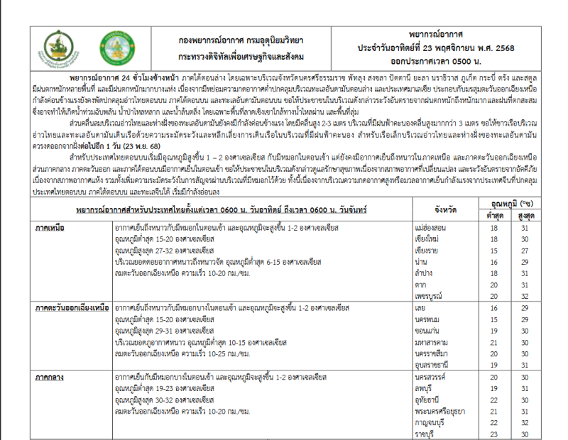 ส่วนคลื่นลมบริเวณอ่าวไทยและห่างฝั่งของทะเลอันดามันยังคงมีกำลังค่อนข้างแรง โดยมีคลื่นสูง 2-3 เมตร บริเวณที่มีฝนฟ้าคะนองคลื่นสูงมากกว่า 3 เมตร ขอให้ชาวเรือบริเวณอ่าวไทยและทะเลอันดามันเดินเรือด้วยความระมัดระวังและหลีกเลี่ยงการเดินเรือในบริเวณที่มีฝนฟ้าคะนอง สำหรับเรือเล็กบริเวณอ่าวไทยและห่างฝั่งของทะเลอันดามันควรงดออกจากฝั่งต่อไปอีก 1 วัน (23 พ.ย. 68)