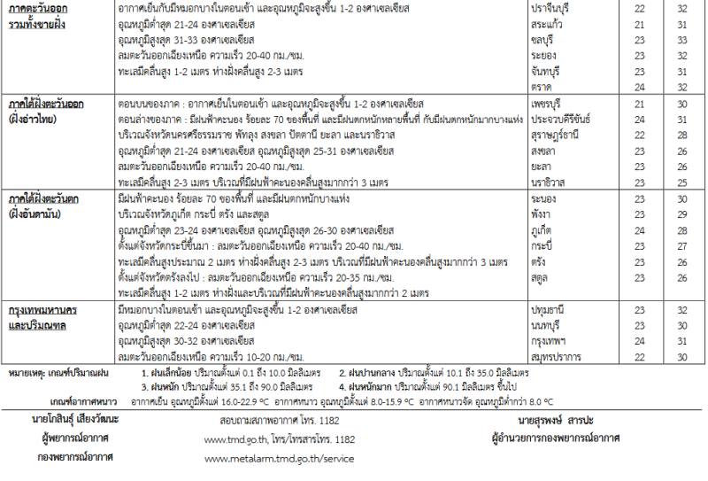 ตั้งแต่จังหวัดตรังลงไป : ลมตะวันออกเฉียงเหนือ ความเร็ว 20-35 กม./ชม.